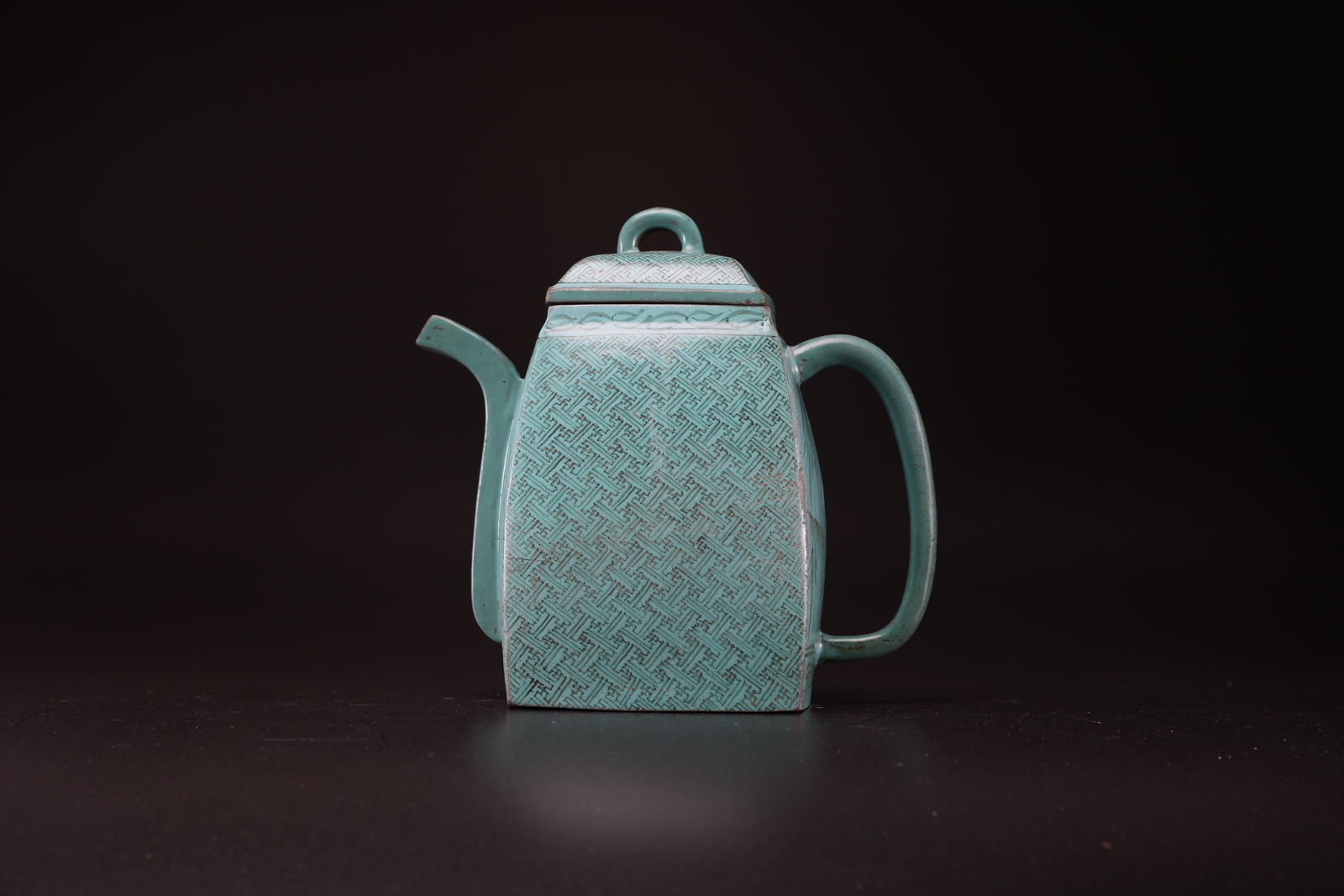Arte Cinese Teiera Yixing con tappo smaltata di verde e decorata con motivi geometrici intrecciati ed elementi vegetali. Marcata sulla base.