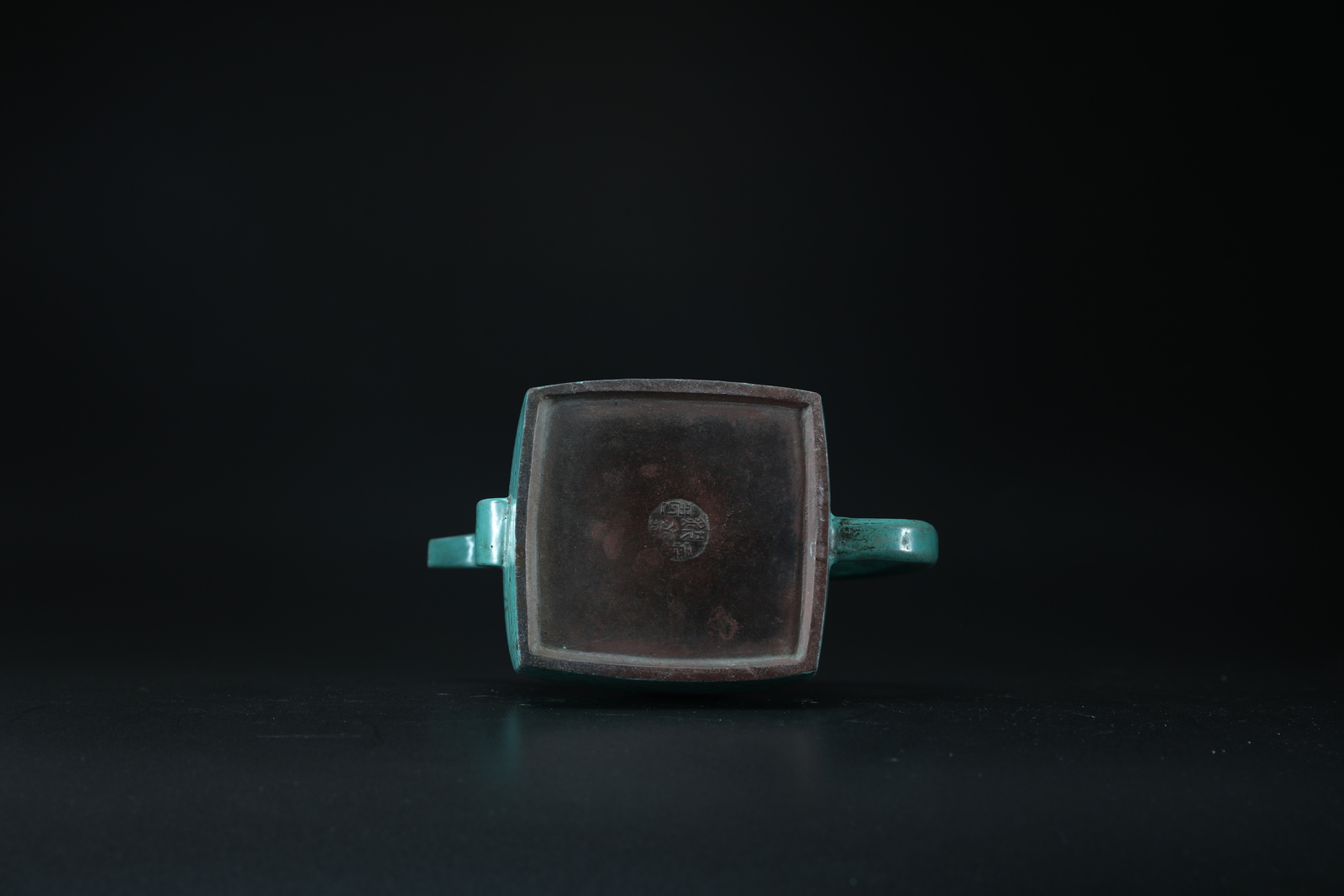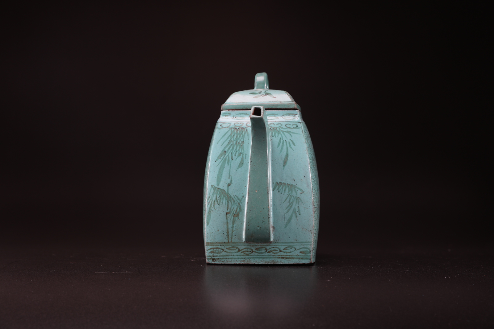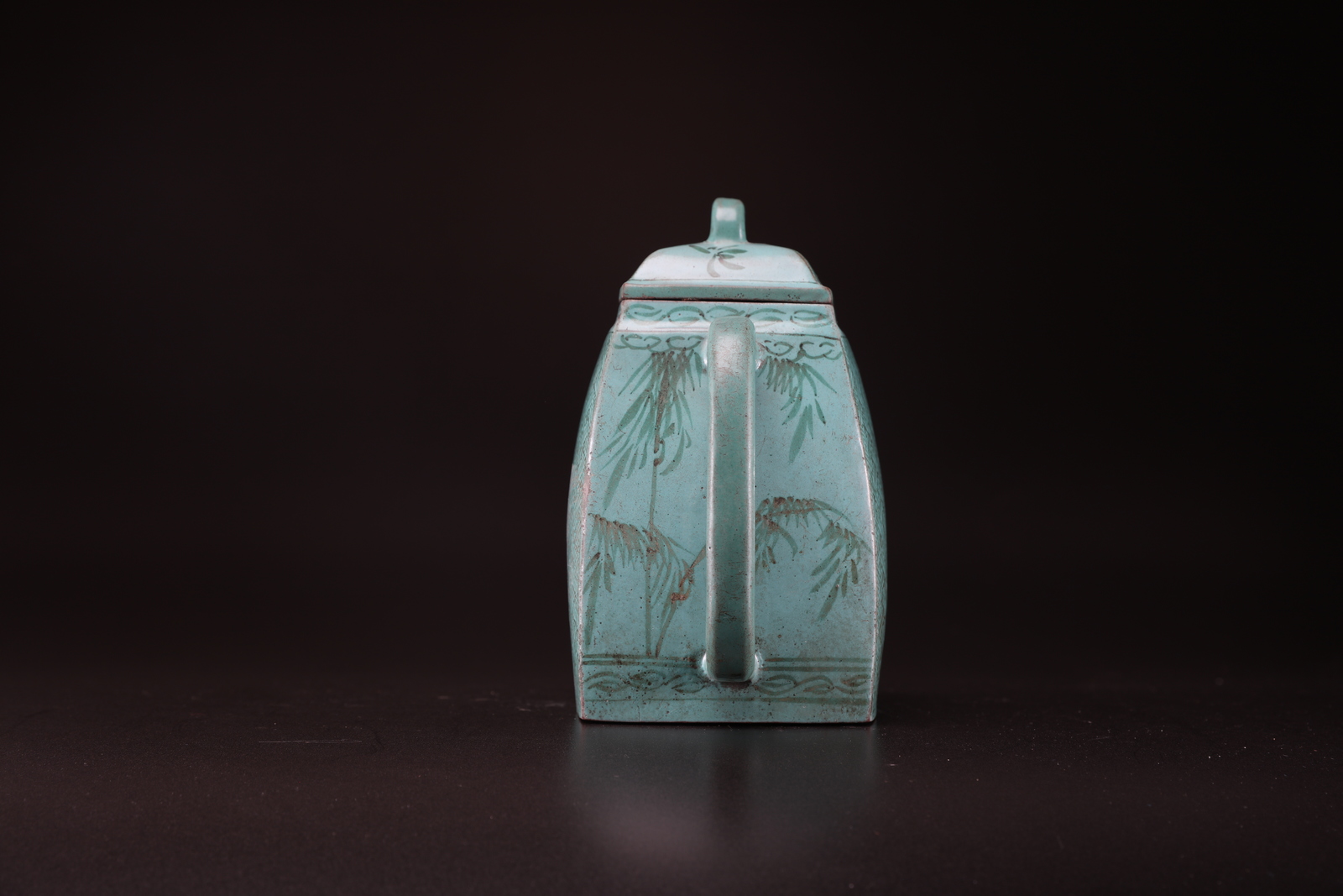 Arte Cinese Lidded Yixing teapot with green enamel decorated with geometric patterns and vegetal motifs and bearing an incised mark at the base