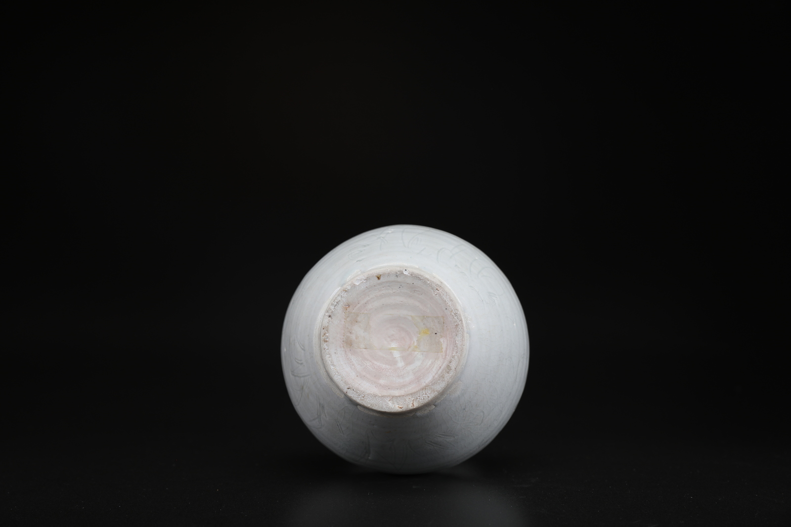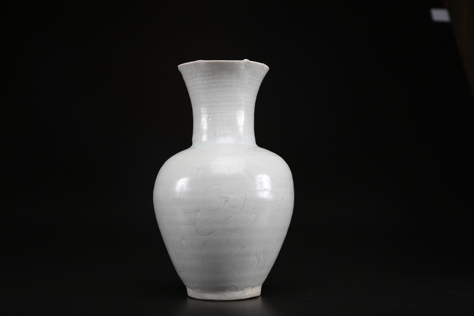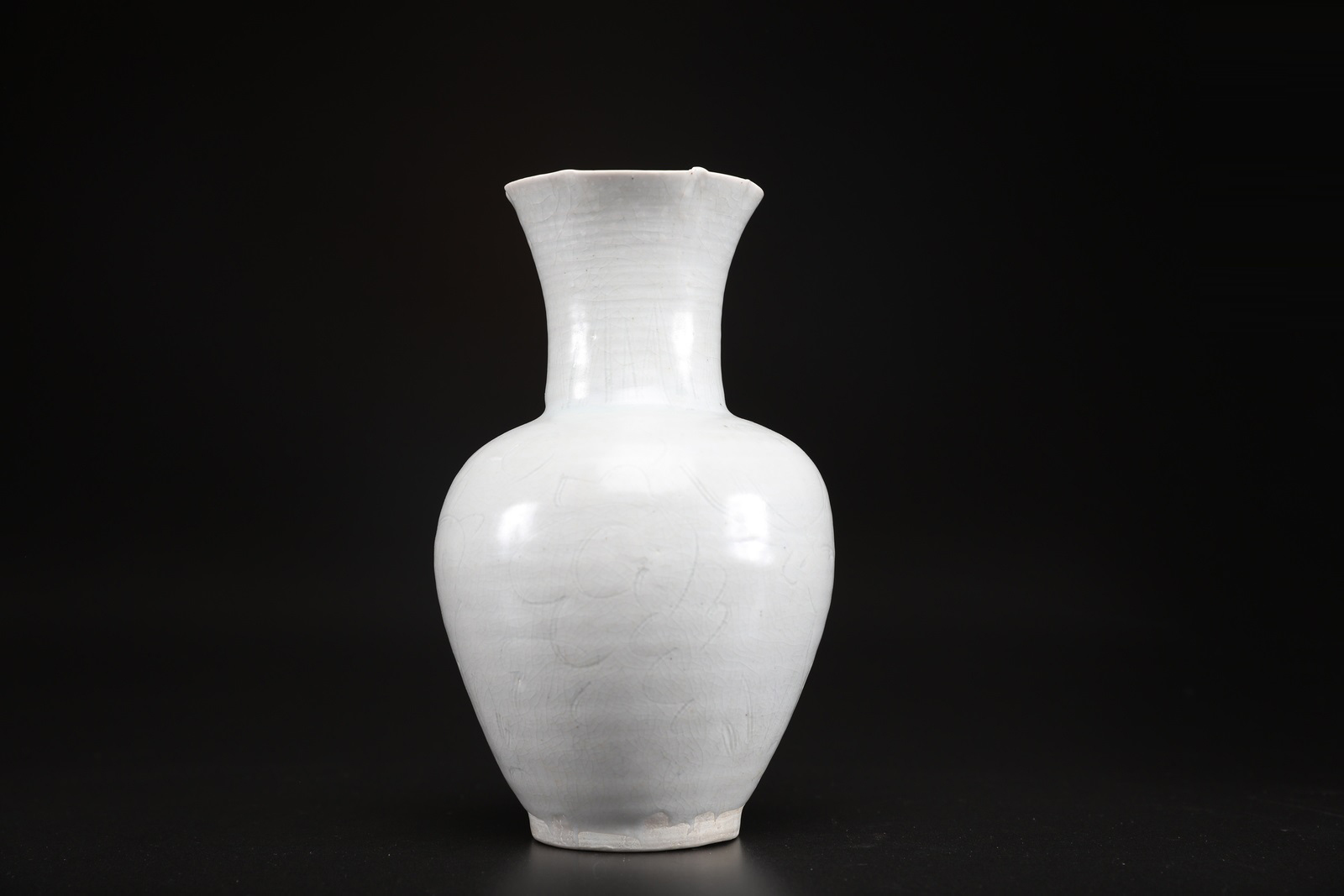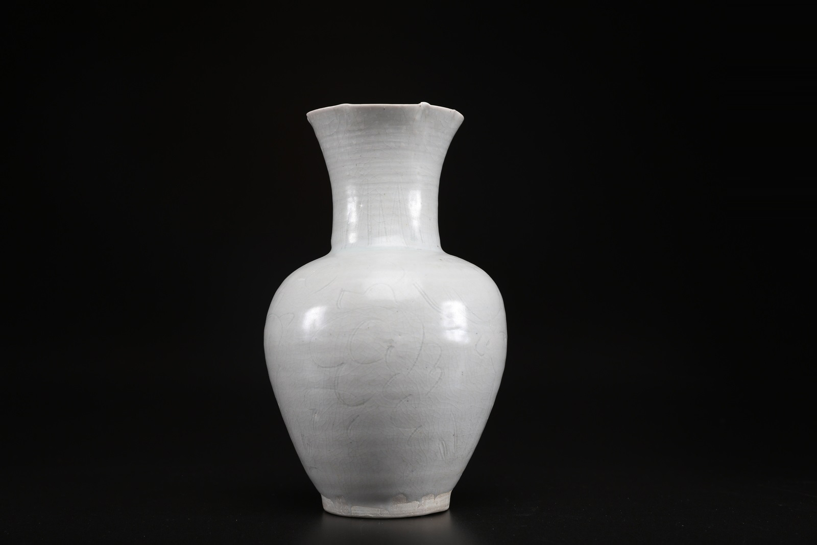 Cina, dinastia Song. . Cm 24,00. Poggiante su disco con ampia pancia e spalle spioventi su cui si innesta il collo cilindrico con bordo superiore estroflesso e finemente sagomato con petali.