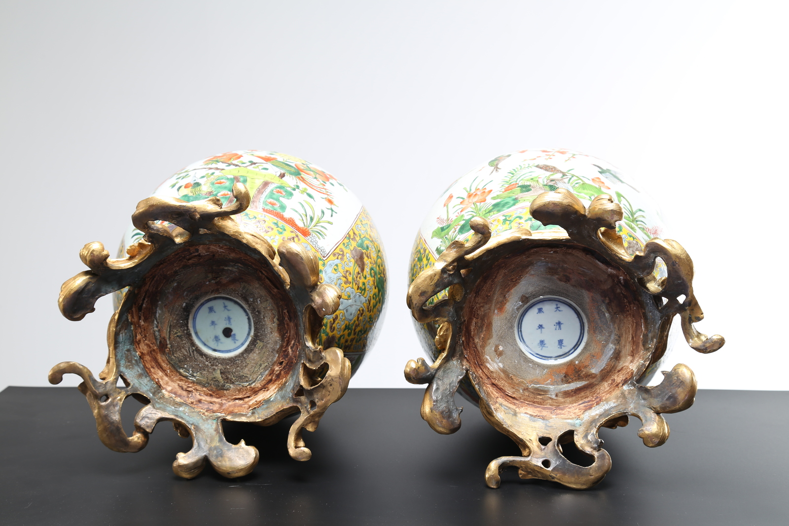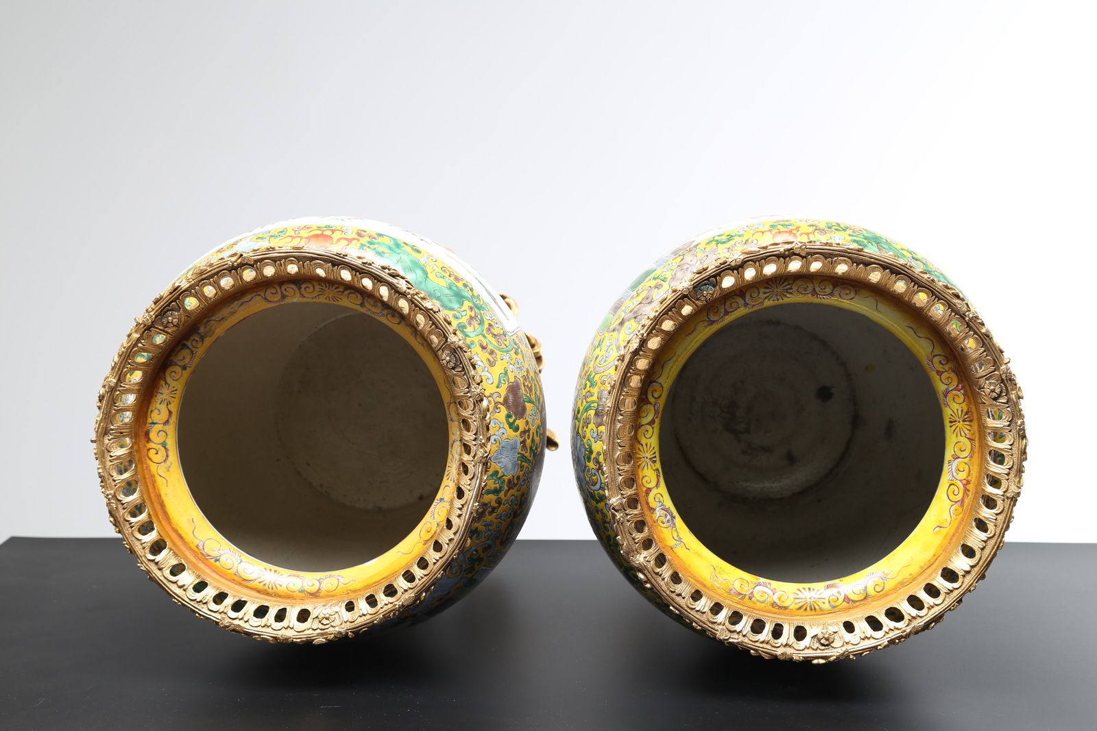 Cina, dinastia Qing. . Cm 26,50 x 35,50. Lo sfondo giallo decorato con dragoni all'inseguimento della perla fiammeggiante interrotti da due grandi riserve raffiguranti papere in uno stagno ed uccelli su rami di ciliegio in fiore. Marchio a sei caratteri Kangxi entro doppio cerchio dipinto sulla base e montaggio europeo in bronzo dorato sulla base e sul bordo superiore.