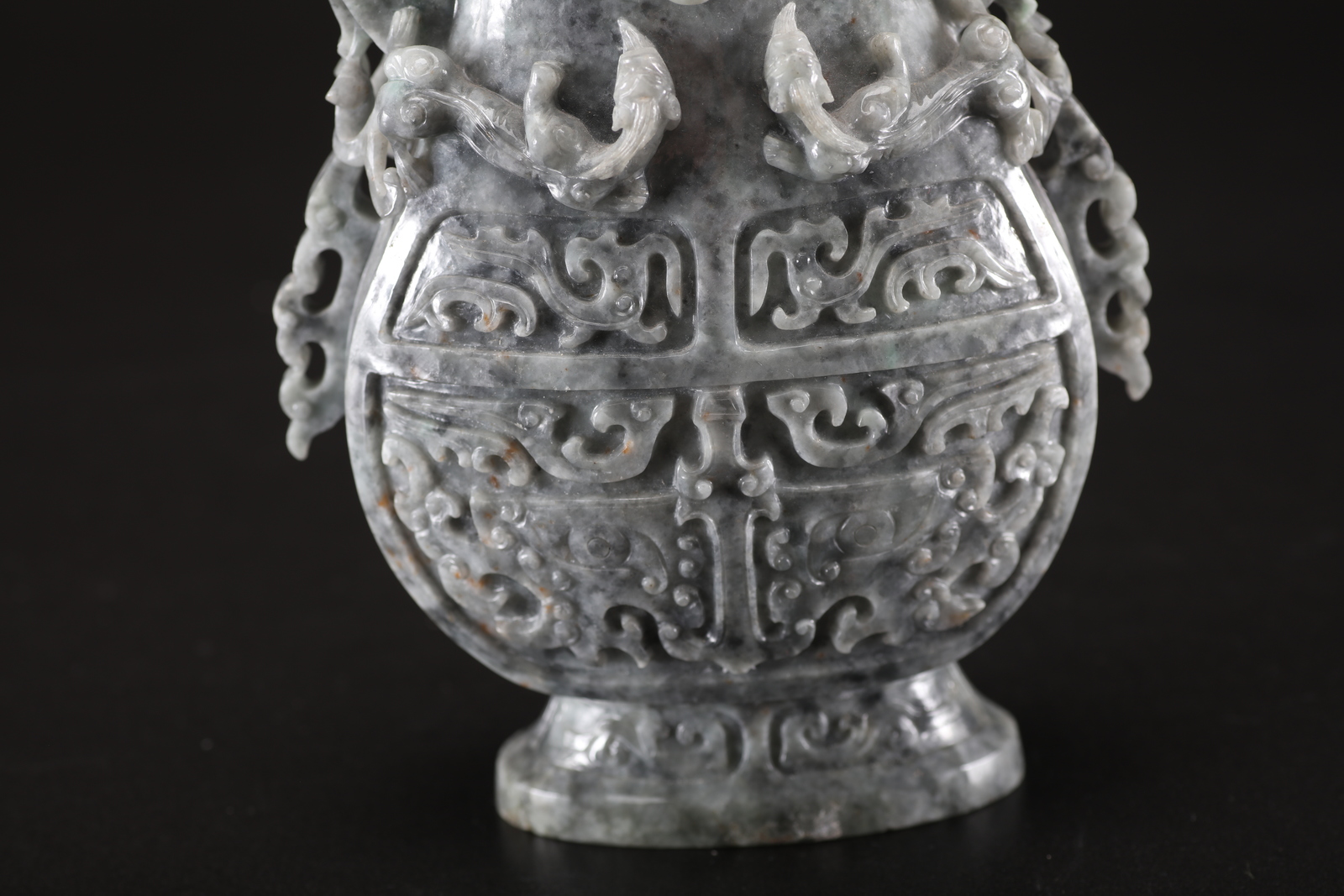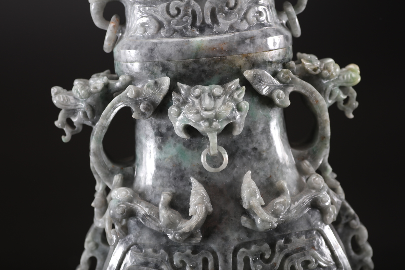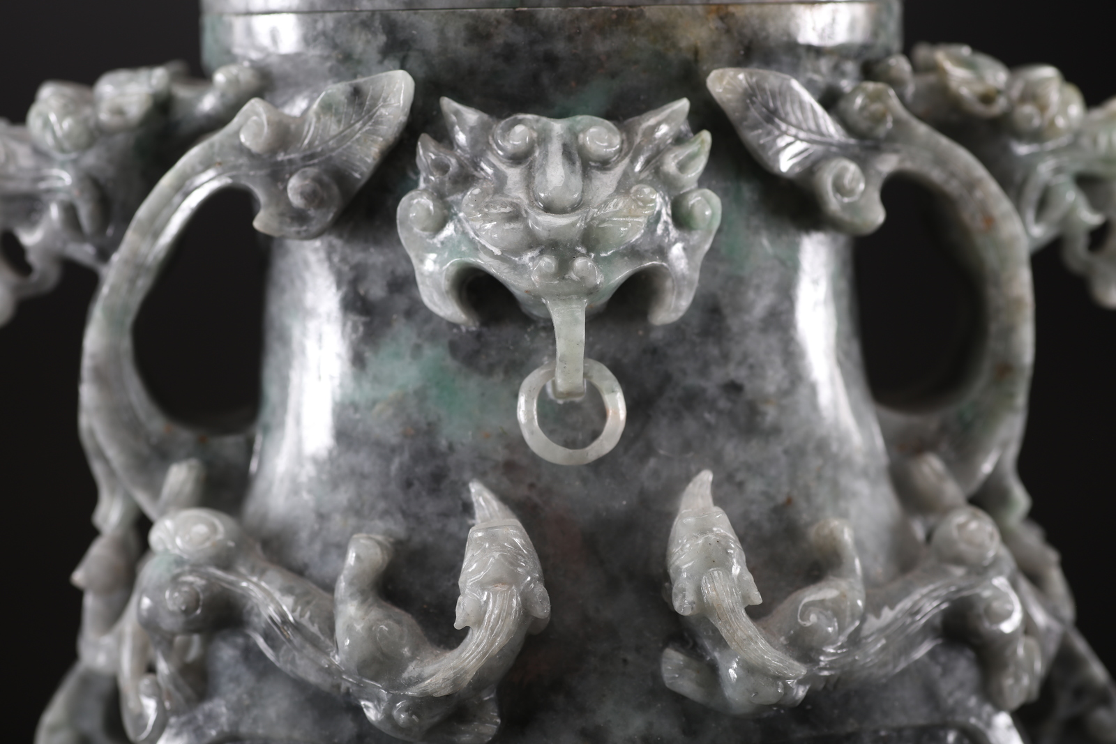 Arte Cinese A grey jadeite carved vase with archaic shape and decoration of taotie masks, chilong shaped handles and bixie top cover