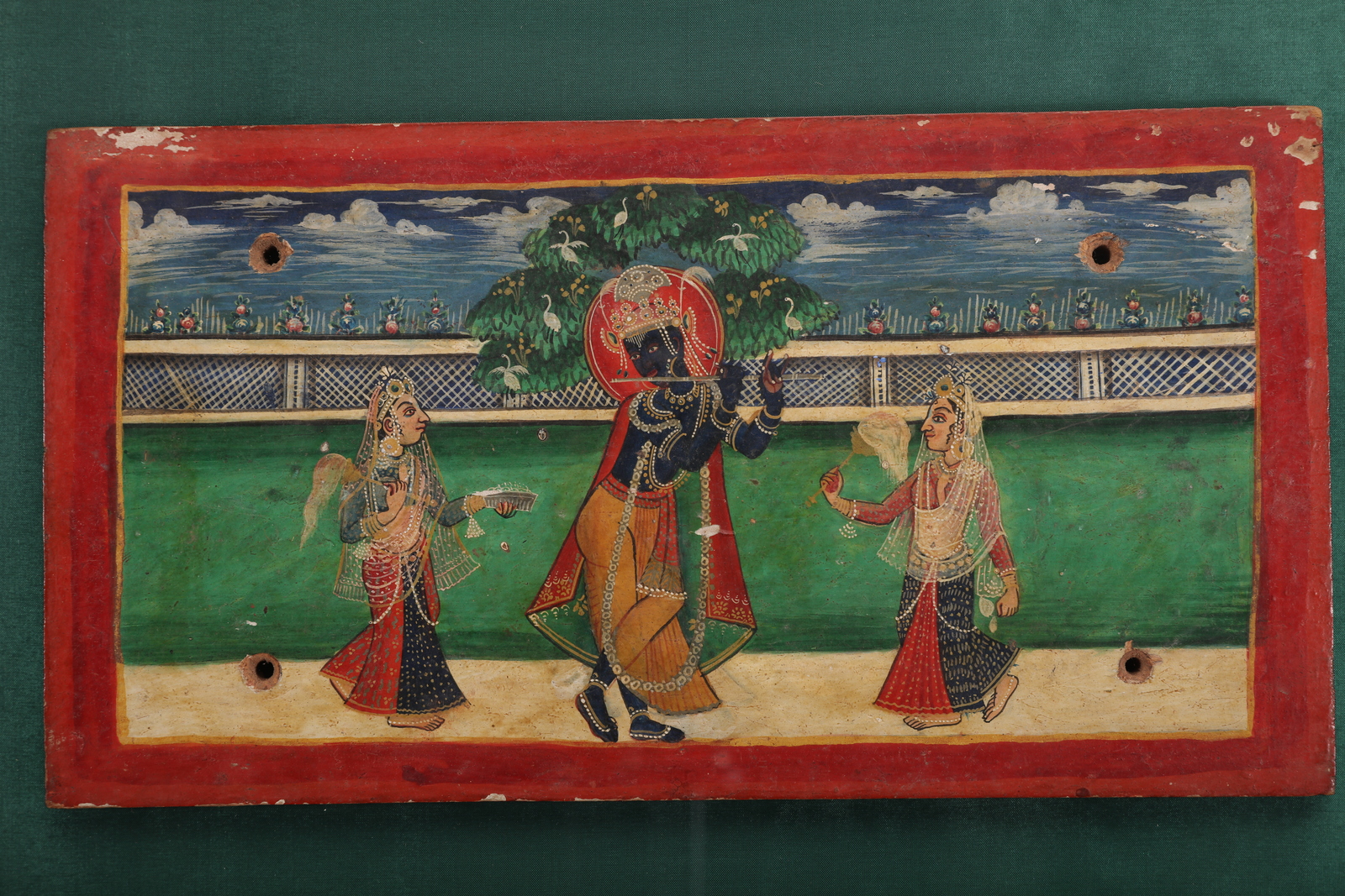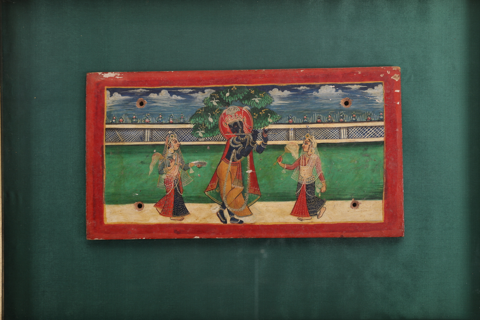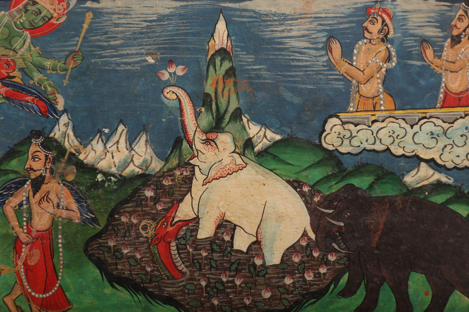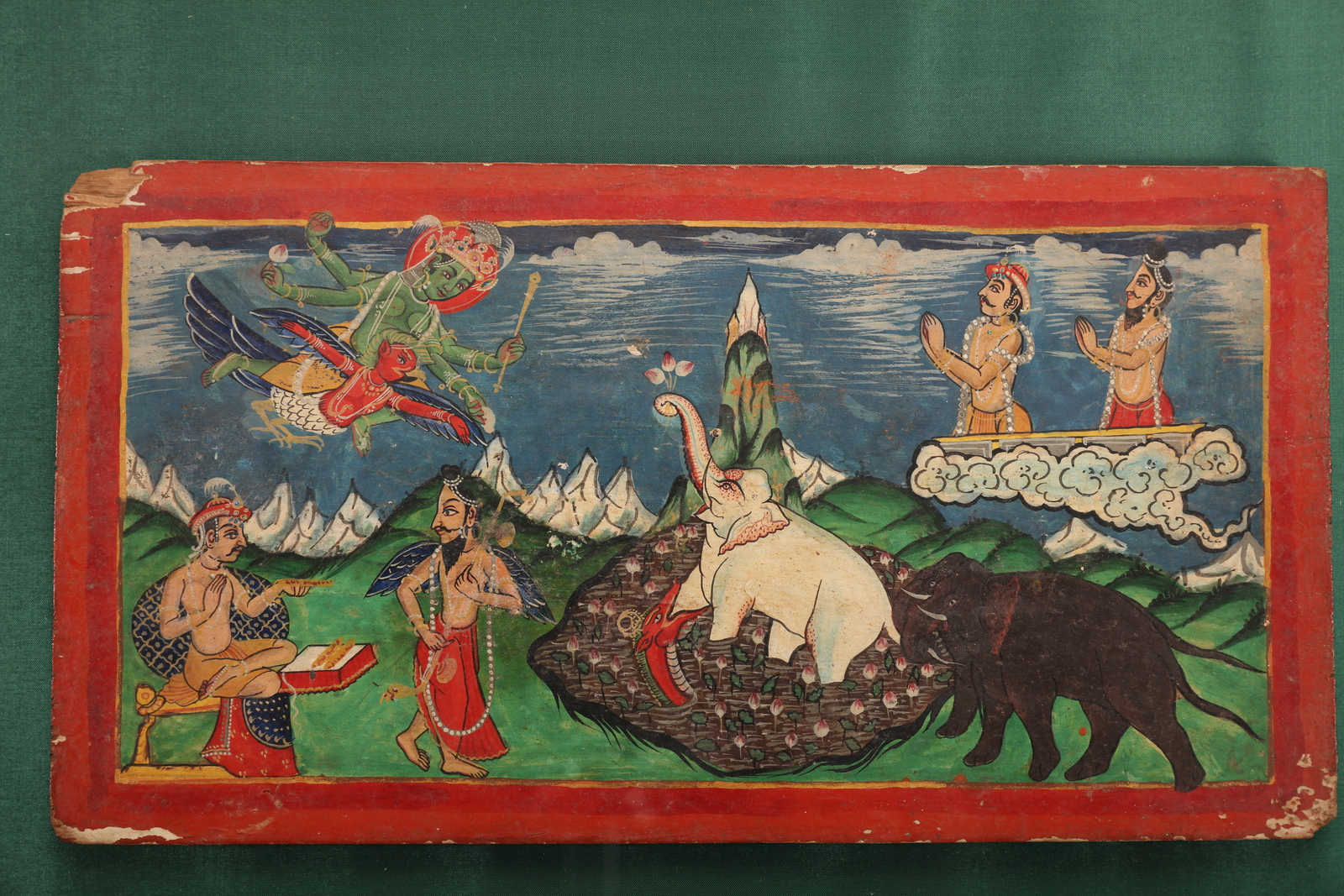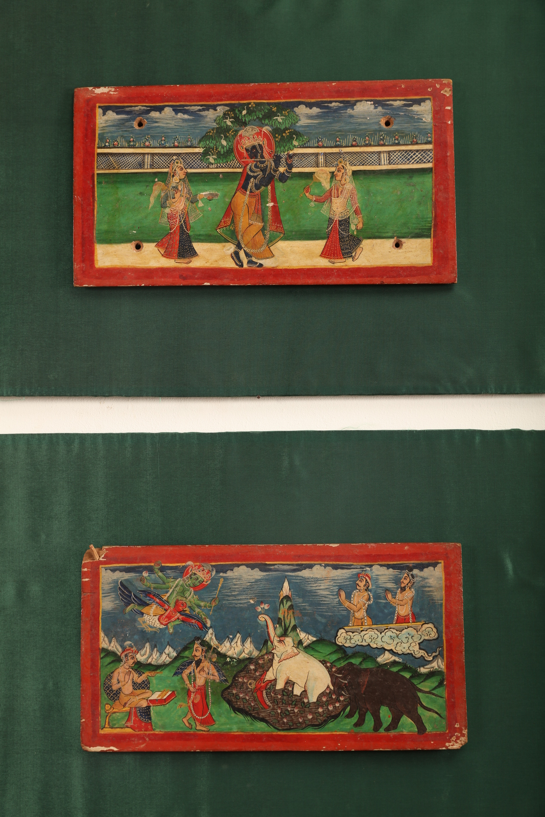 Nepal, XIX secolo. -. Cm 53,00 x 38,00. Due copertine di libro devozionale in legno laccato raffiguranti l'una Krishna con le gopi e l'altra raffigurante Gajendra Moksha ovvero la liberazione dell'elefante Gajendra grazie alla benevolenza di Visnu.