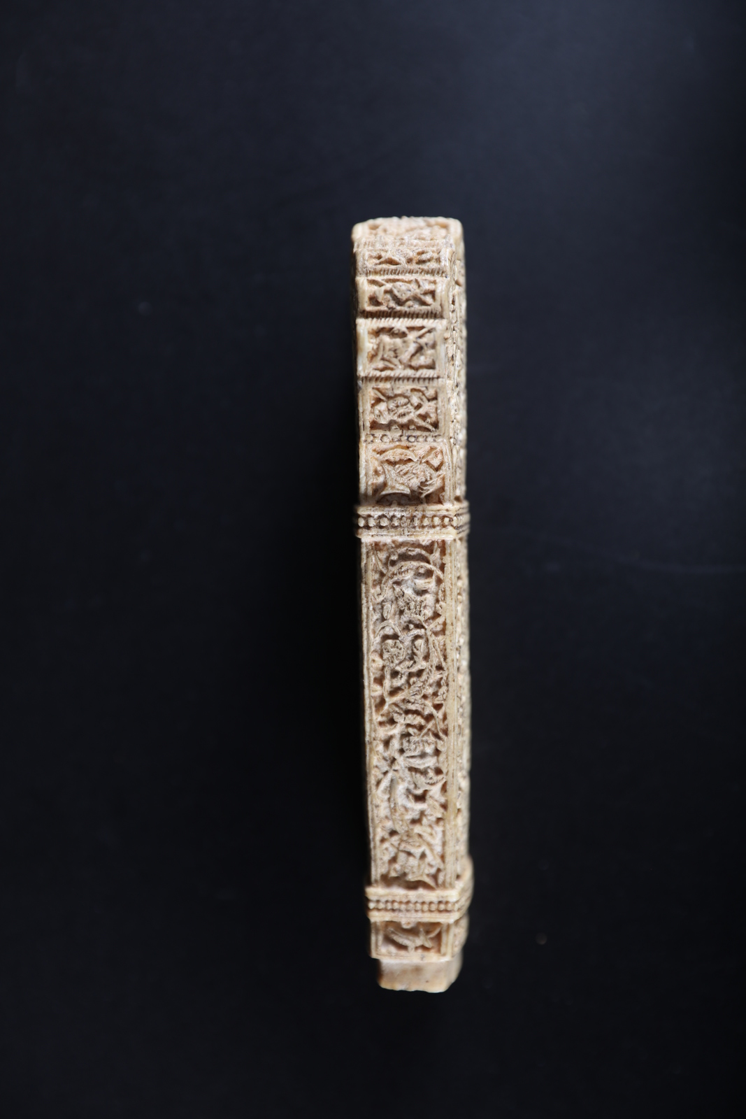 Turkey, Ottoman dynasty, 16th century. . Cm 4,00 x 12,50 x 1,50. The hilt ends in a lobed and cuspidate element, and shows intricate and very fine carvings of interwoven half-palmettes on all sides. Hilts of this kind were typical of the Ottoman production of the XVI – XVII centuries. Furthermore, similar decorations are present on two ivory mirrors made for Suleiman the Magnificent in 1543 – 1554 (Atil, The Age of Sultan Suleyman the Magnificent, 1987, p. 139).