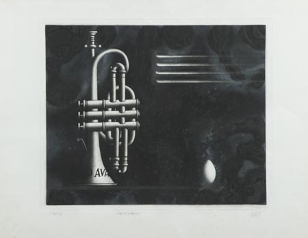 Mario Avati Principato di Monaco 1921 Parigi 2009 L'oeuf et la trompette, 1966, Acquaforte e acquatinta, cm. 36,5x44, su carta di cm. 48x62,5, es. terzo stato 11/13 Firma e data in basso a destra, titolo e tiratura in basso a sinistra.