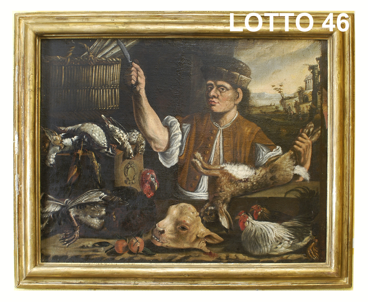 BARTOLOMEO ARBOTORI (1594 – 1676) DIPINTO OLIO SU TELA RAFF. SELVAGGINA CON POLLIVENDOLO MIS. 109 X 140 CORREDATO DA AUTENTICA