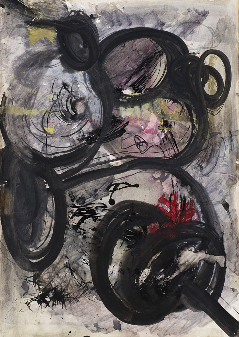 Pinot Gallizio (Alba 1902 - 1964) "Senza titolo" tecnica mista su cartoncino, cm 69,5x49,5 Dono dell'artista al padre dell'attuale proprietario (Il padre, Emanuele Micheli, primario del reparto di chirurgia dell'ospedale di Alba nel 1954, fondò con il pittore Parisot la rivista d'arte astratta "I 4 SOLI" ed ebbe modo di conoscere ed entrare in amicizia con il pittore) Pinot Gallizio (Alba 1902 - 1964) "Untitled" mixed media on cardboard, cm 69,5x49,5 Donated by the artist to the father of the present owner (The father, Emanuele Micheli, head of the surgery ward of the hospital of Alba in 1954, founded with the painter Parisot the Abstract art magazine called "I 4 SOLI" and had the opportunity to meet and become friends with the painter)