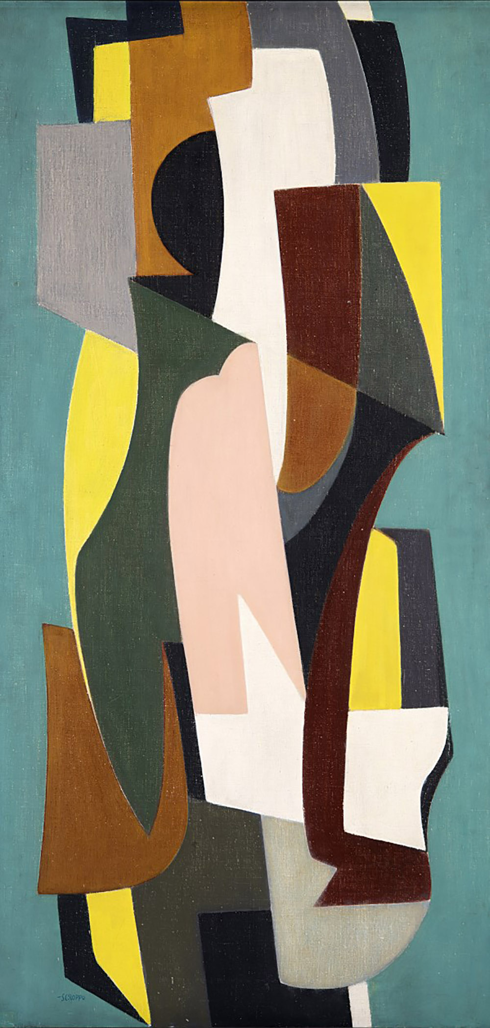 Filippo Scroppo (Riesi 1910 - Torre Pellice 1993) "Sviluppi 1954 opera 27" 1954 olio su tela, cm 120x60 Firmato in basso a sinistra. Firmato al retro Provenienza Collezione privata, Torino Esposizioni "Arte italiana del XX secolo" mostra itinerante Galleria Nazionale di Melbourne, Sidney, Perth, Brisbane, Adelaide, Hobart, 1956 Filippo Scroppo (Riesi 1910 - Torre Pellice 1993) "Sviluppi 1954 opera 27" 1954 oil on canvas, cm 120x60 Signed lower left. Signed on verso Provenance Private collection, Turin Exhibited "Arte italiana del XX secolo" mostra itinerante Galleria Nazionale di Melbourne, Sidney, Perth, Brisbane, Adelaide, Hobart, 1956