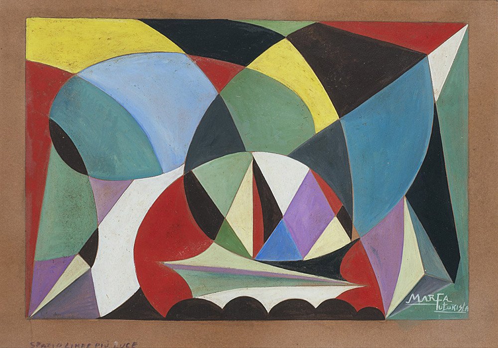 Marfa Futurista (Tripoli 1875 - Roma 1956) "Spazio linee più luce" 1912 ca. tempera su carta applicata su cartoncino, cm 26x35 Firmato e titolato Al retro "Marfa Futurista Archivio 61 MF" e timbro Raccolta D'Arte Donna Regina Giansanti inventario n.32D Provenienza Bottega d'Arte Mameli, Roma Collezione Ambasciatore Onofrio Solari Bozzi, Roma Marfa Futurista (Tripoli 1875 - Roma 1956) "Spazio linee più luce" 1910-12 tempera on paper on cardboard, cm 26x35 Signed and titled On verso: Marfa Futurista 61 MF and stamp "Raccolta D'Arte Donna Regina Giansanti inventario n.32D" Provenance Bottega d'Arte Mameli, Rome Ambassador Onofrio Solari Bozzi collection, Rome