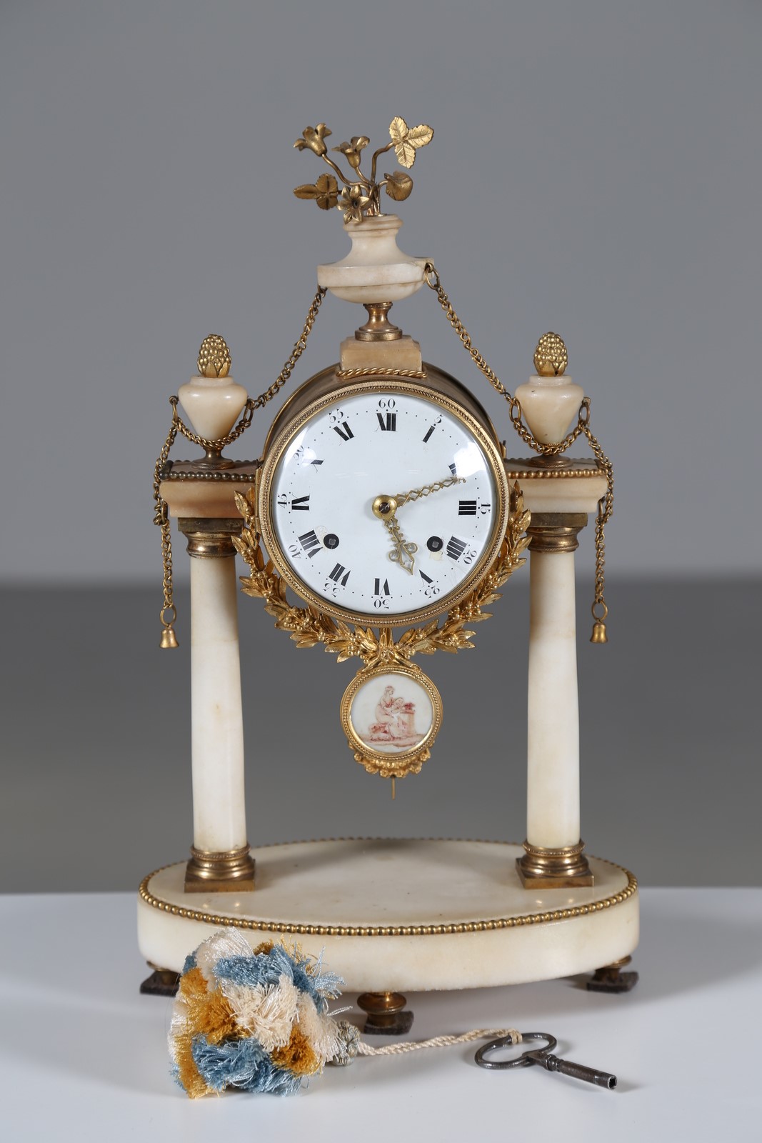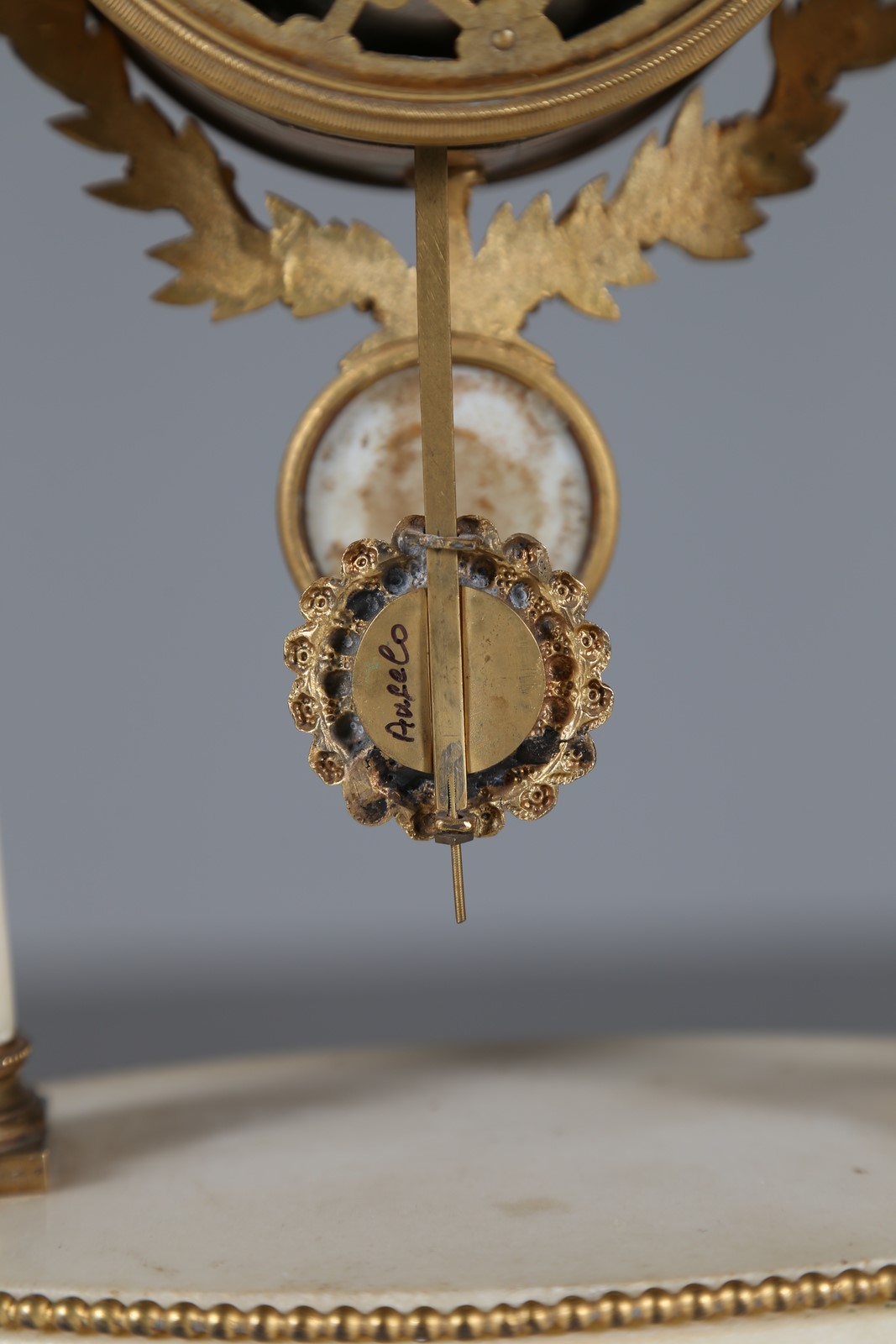 MANIFATTURA FRANCESE DEL XIX SECOLO Elegante orologio da tavolo, in marmo con guarniture in bronzo dorato, con cammeo rappresentante figura classica. . Cm 35,00.