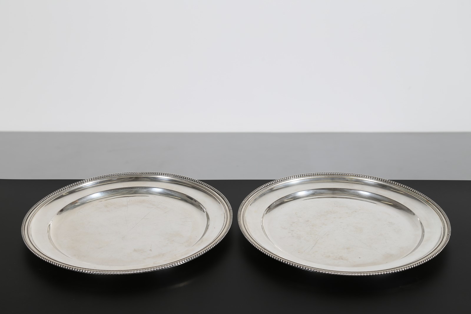 MANIFATTURA ITALIANA DEGLI INIZI DEL XX SECOLO Lotto composto da n.2 piatti tondi. Argento. Cm 35,00 x 2,50. Al fondo incisione R. Miracoli Milano. Peso 2,15 Kg.
