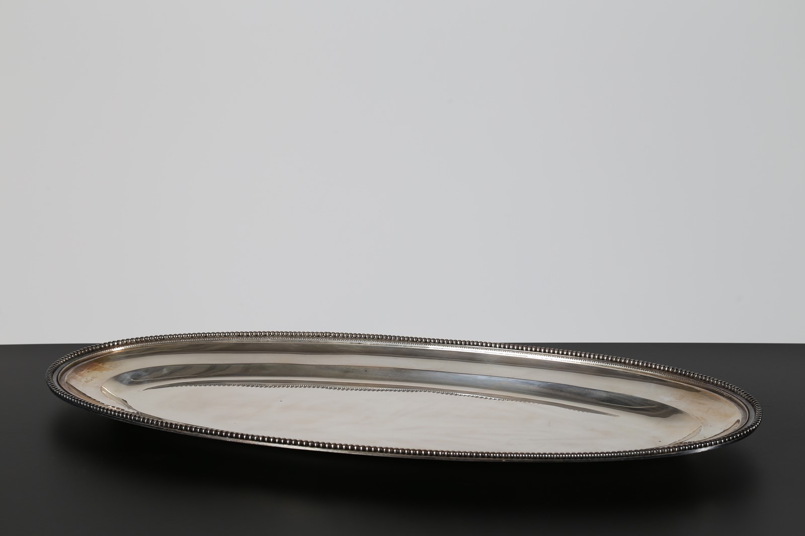 MANIFATTURA ITALIANA DEGLI INIZI DEL XX SECOLO Piatto ovale. Argento. Cm 60,00 x 3,00 x 30,00. Al fondo incisione R. Miracoli Milano. Peso 1,83 Kg.