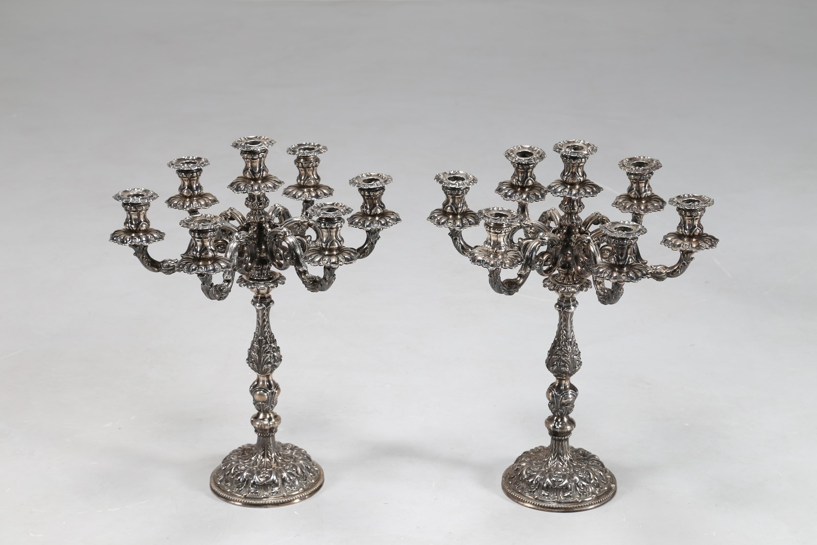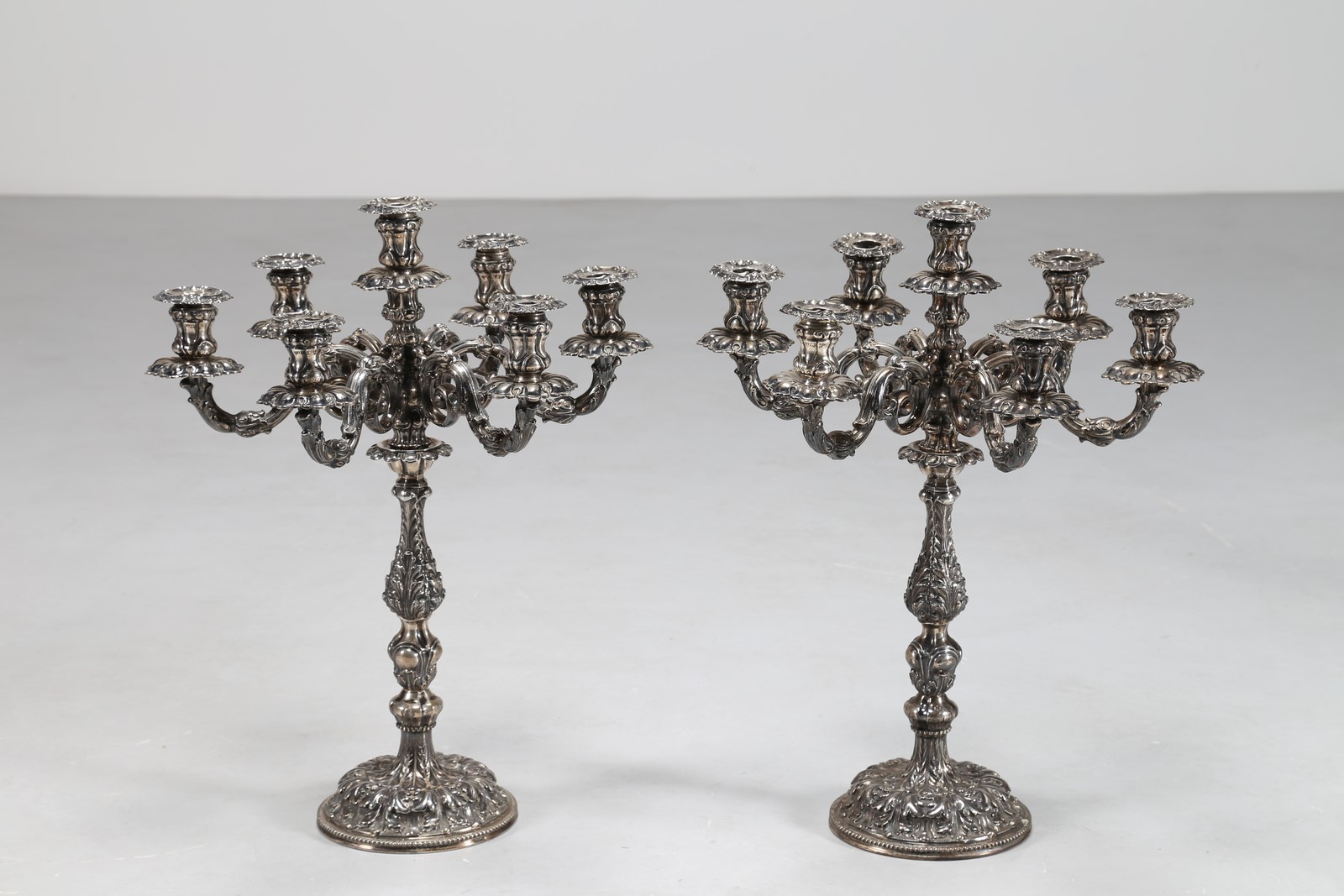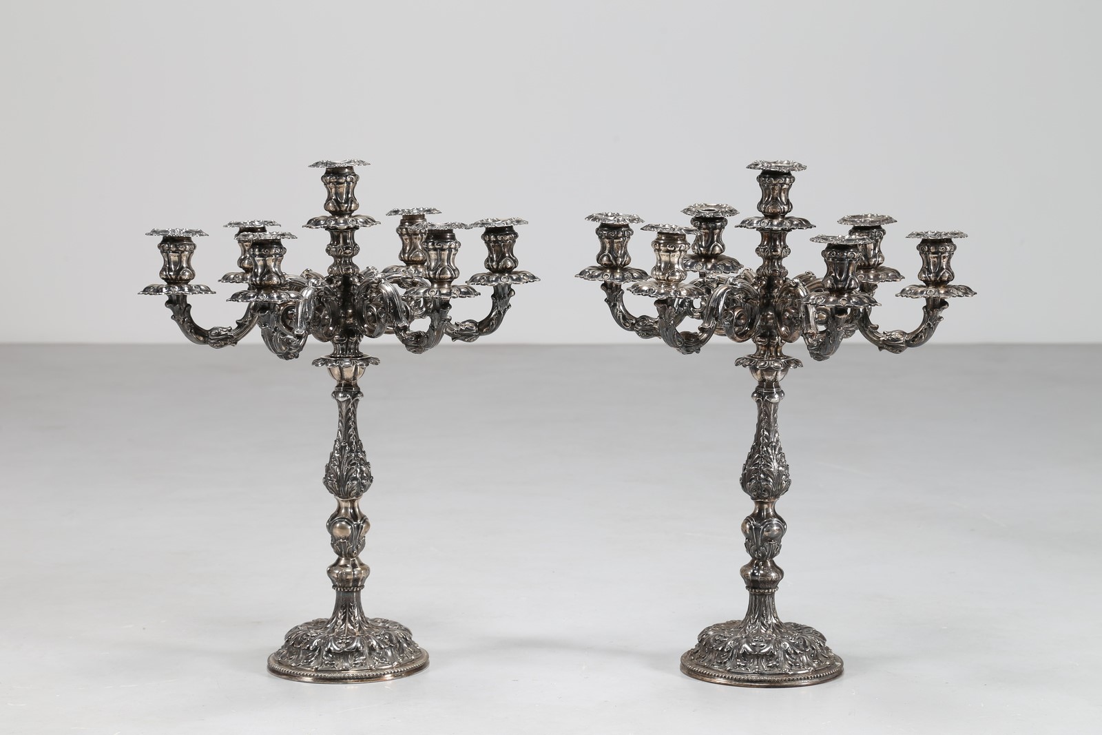 MANIFATTURA ITALIANA DEGLI INIZI DEL XX SECOLO Coppia di candelabri a sette fiamme. Argento. Cm 47,00 x 57,50. Punzoni italiani, anni trenta del ventesimo secolo. Peso 6,56 Kg.