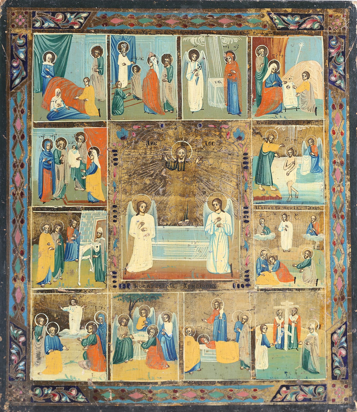 ICONA DEL XIX SECOLO Dodekaorton - Dodici Feste. Tempera all’uovo su tavola lignea. Cm 31,00 x 35,00. Russia meridionale, La figura del Cristo presenta cadute e restauri.