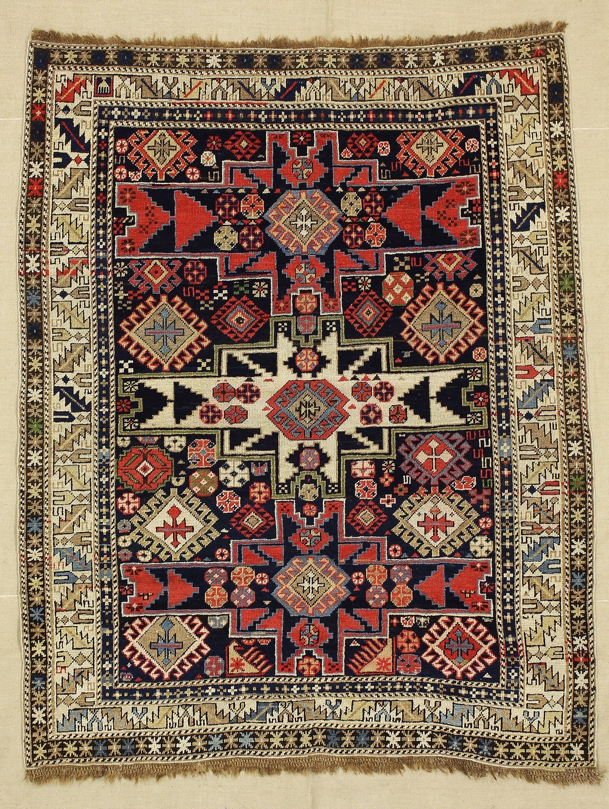 SHIRWAN LESGHI Caucaso. 1900 circa. Fondo blu, tre centri stelli, bordo...