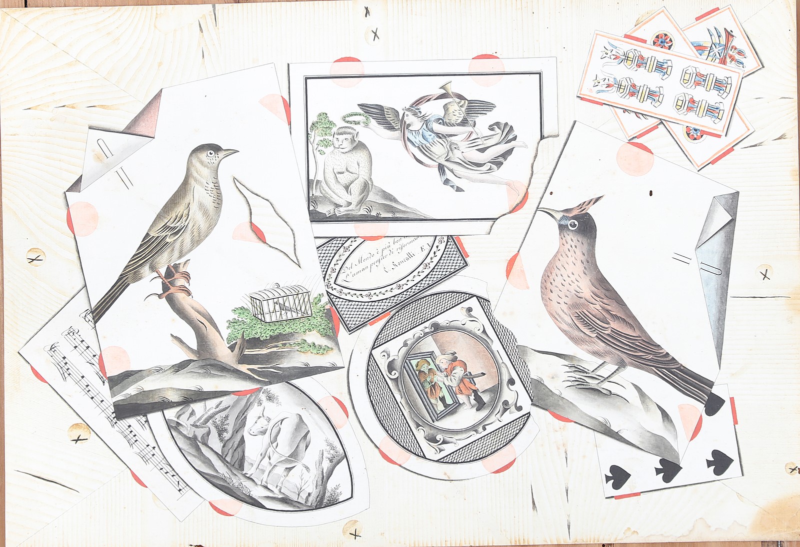 ARTISTA DEL XIX SECOLO Coppia di trompre l'oeil. 1802. Stampa ritoccata a mano. Cm 46,00 x 31,00. una delle due firmata Roncalli, l'altra datata. Cornice presente