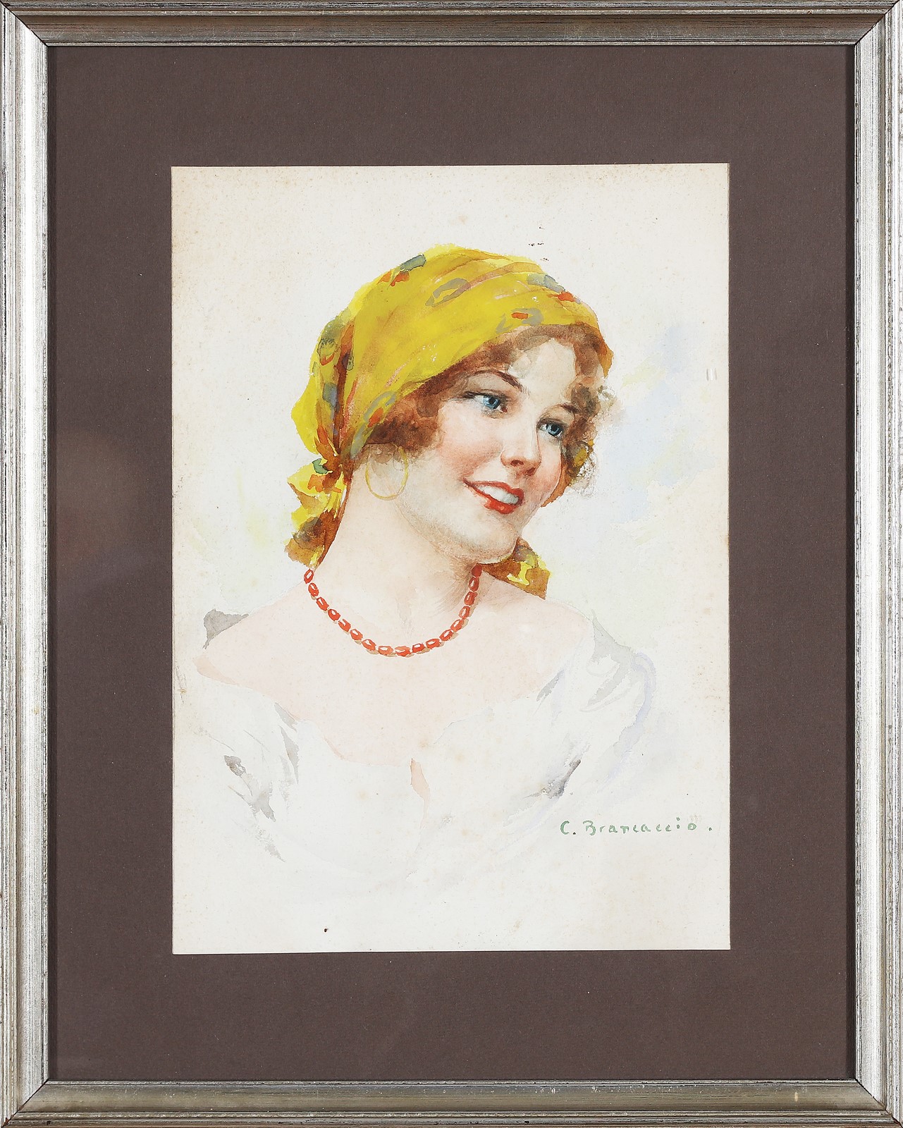 BRANCACCIO CARLO (1861 - 1920) Ritratto di giovane donna. . Acquarello su carta. Cm 34,00 x 44,00. Firma in basso a destra. Al retro cartiglio di provenienza a cura di Bocchialini, Parma. . Cornice presente