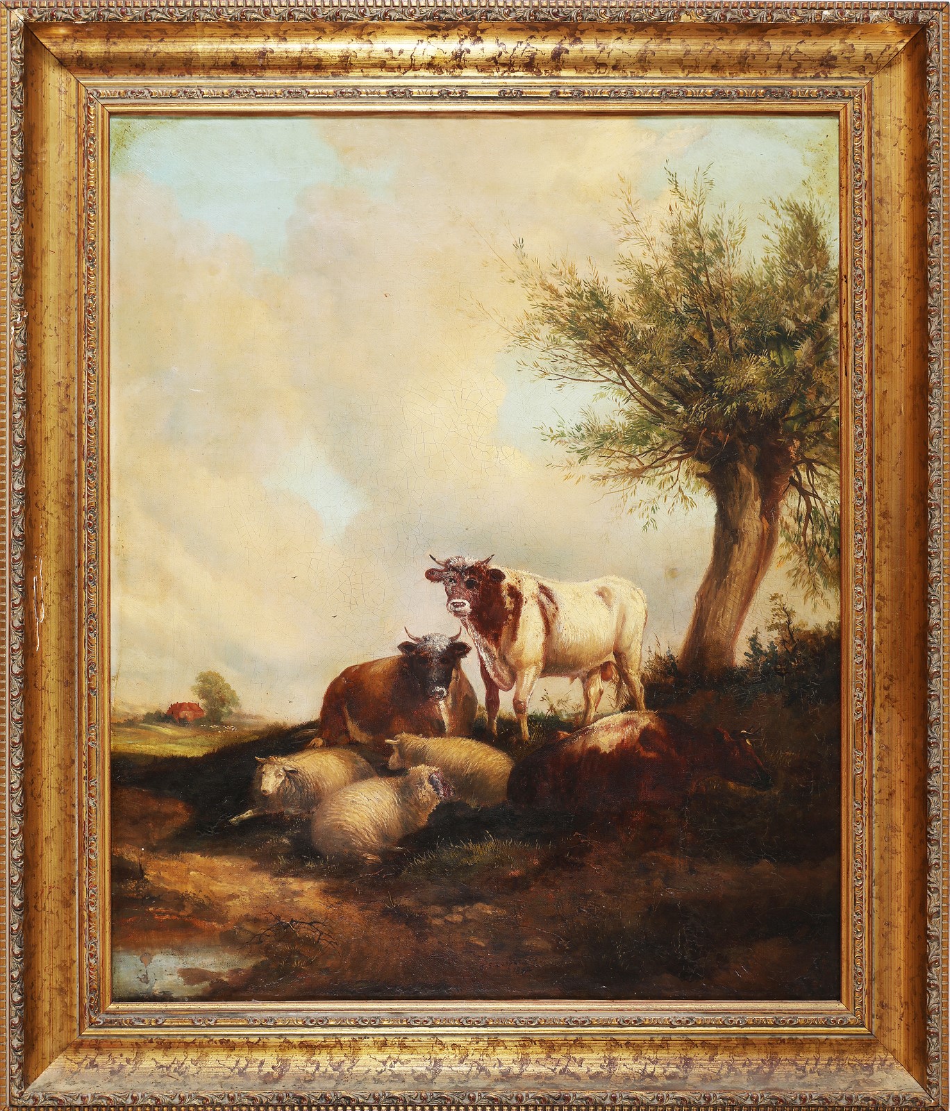 ARTISTA INGLESE DEL XIX SECOLO Mucche e pecore al pascolo. . Olio su tela. Cm 50,00 x 60,00. . Cornice presente