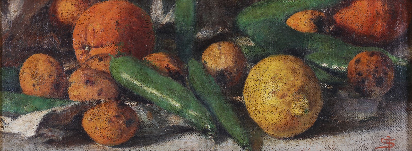 ANONIMO DEL XIX SECOLO Natura morta. 1880. Olio su tela applicata su tavola. Cm 41,50 x 16,00. Firma non leggibile in basso a destra. Cornice presente
