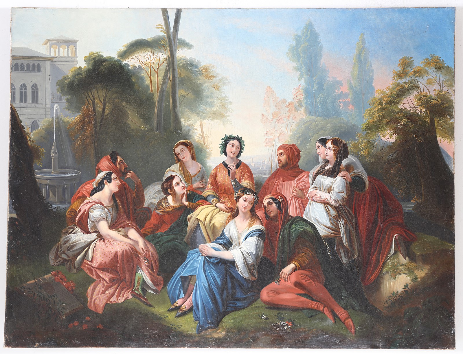 PITTORE DEL XIX SECOLO Il Decamerone. Olio su tela . Cm 116,00 x 89,00.