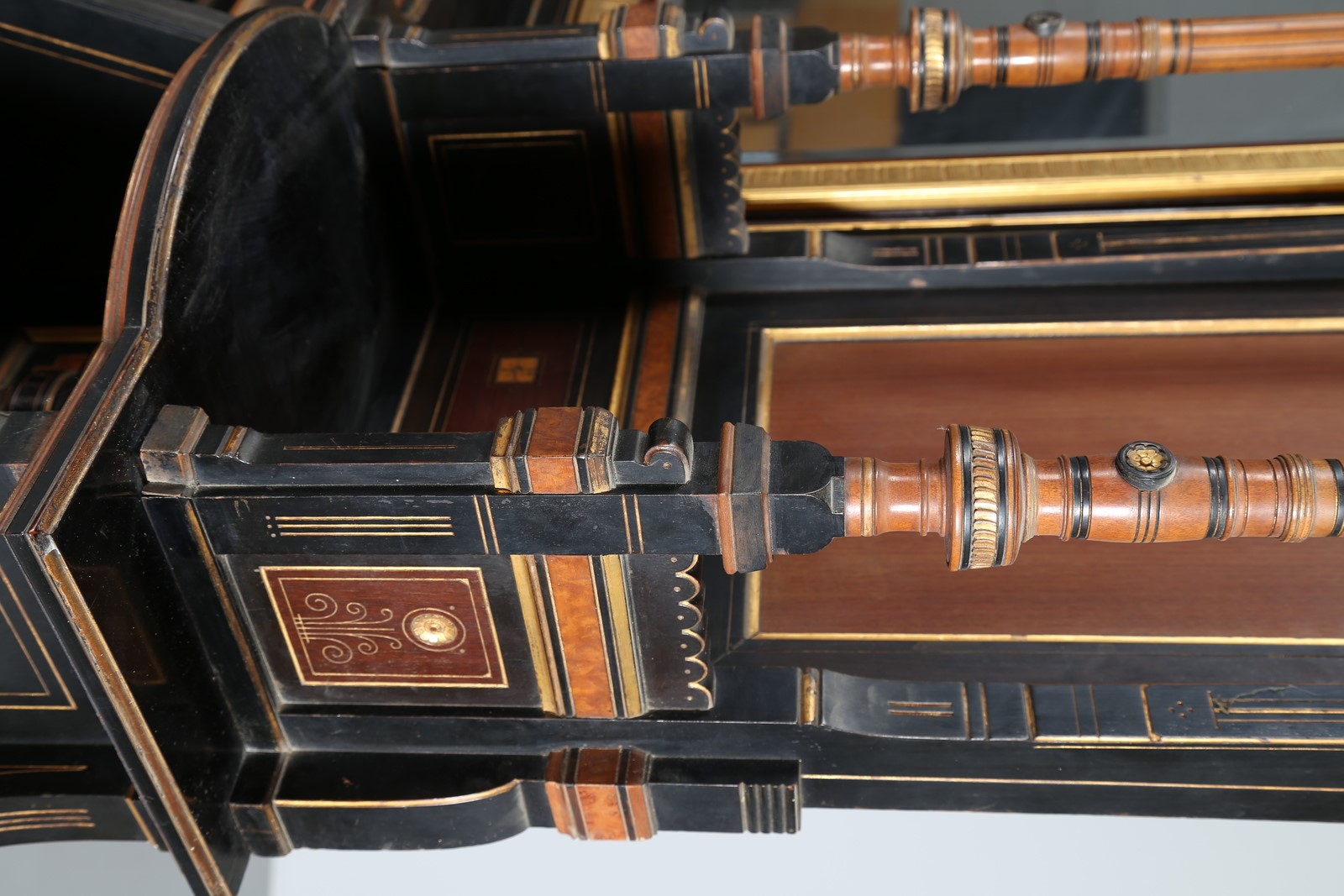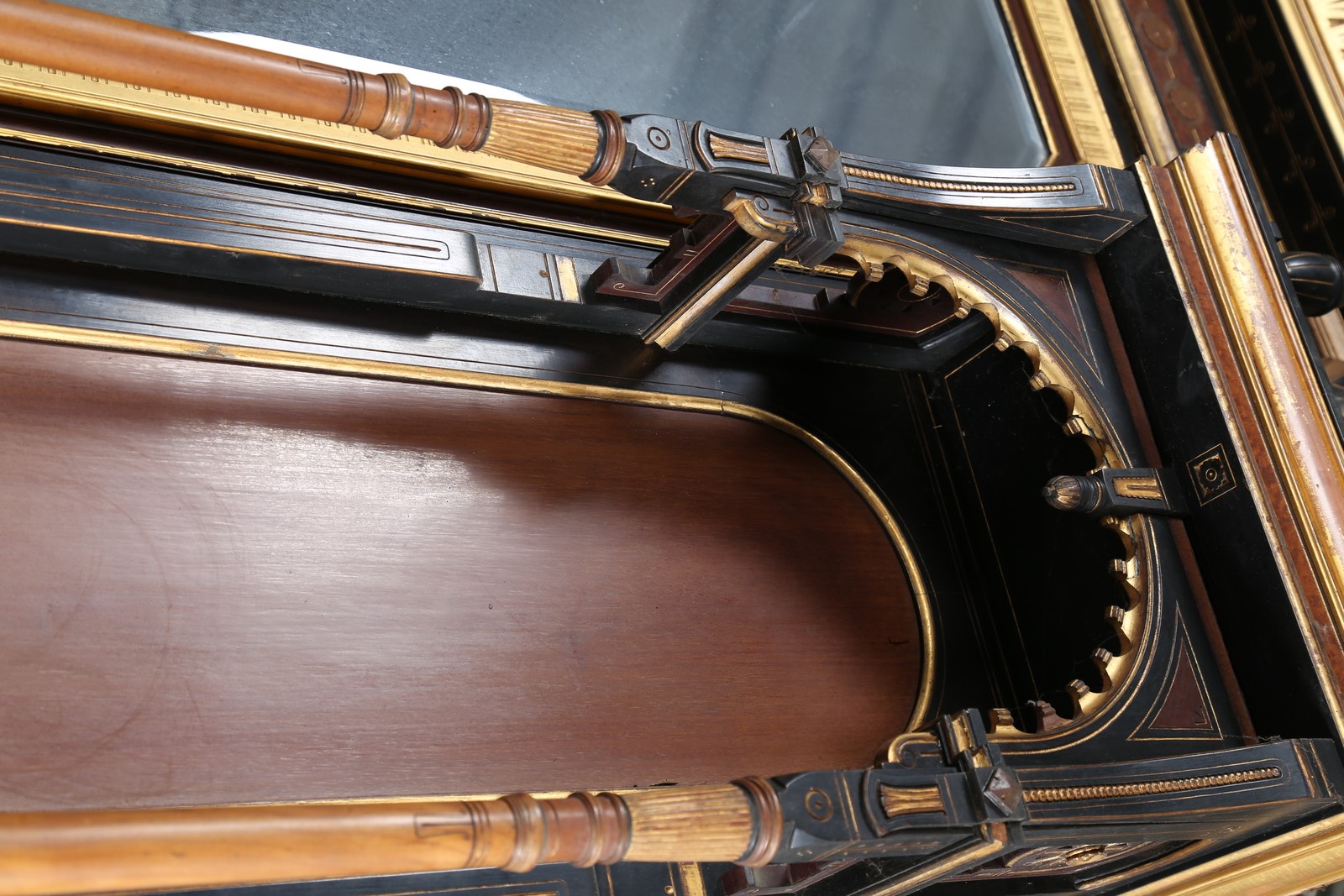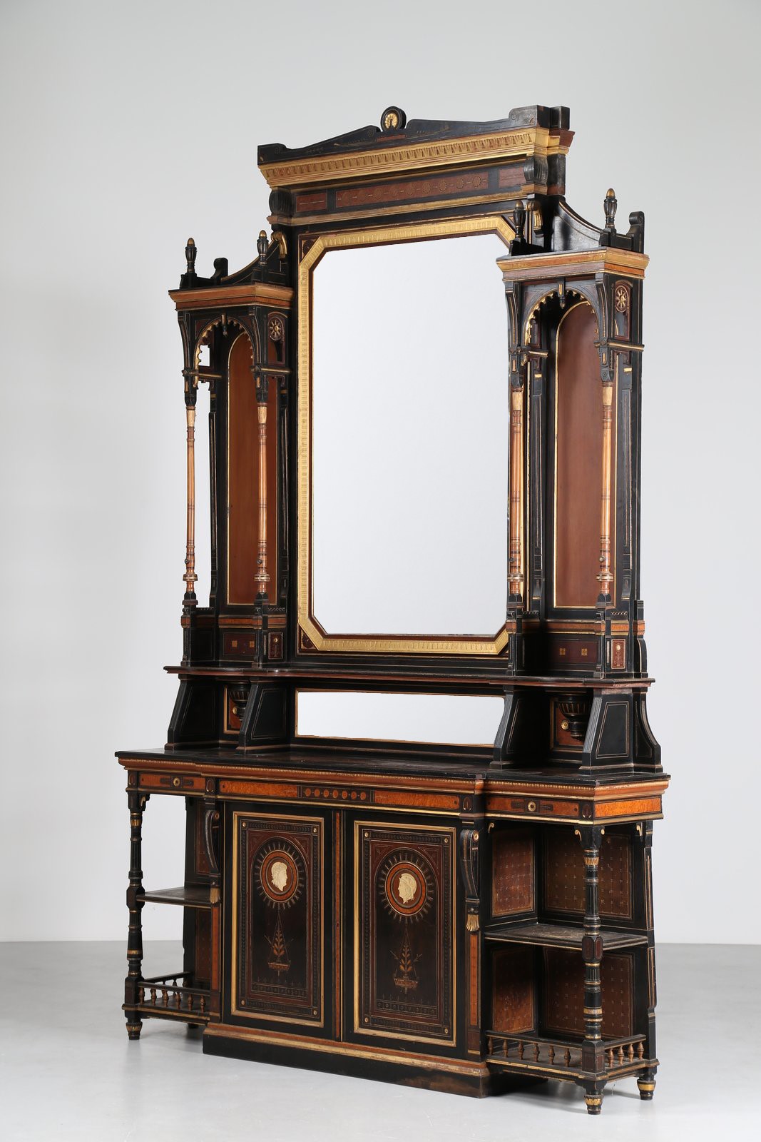 MANIFATTURA LAMB (XIX SECOLO) Importante mobile a doppio corpo, in legno ebanizzato ed intarsiato a raffigurare sulle ante profili classici e festoni. La parte superiore caratterizzata da un grande specchio centrale in cornice sagomata e dorata. Fine XIX secolo. Intarsio su legno. Cm 214,00 x 329,00 x 48,00. Riporta la stampiglia manchester lamb e numero di serie.