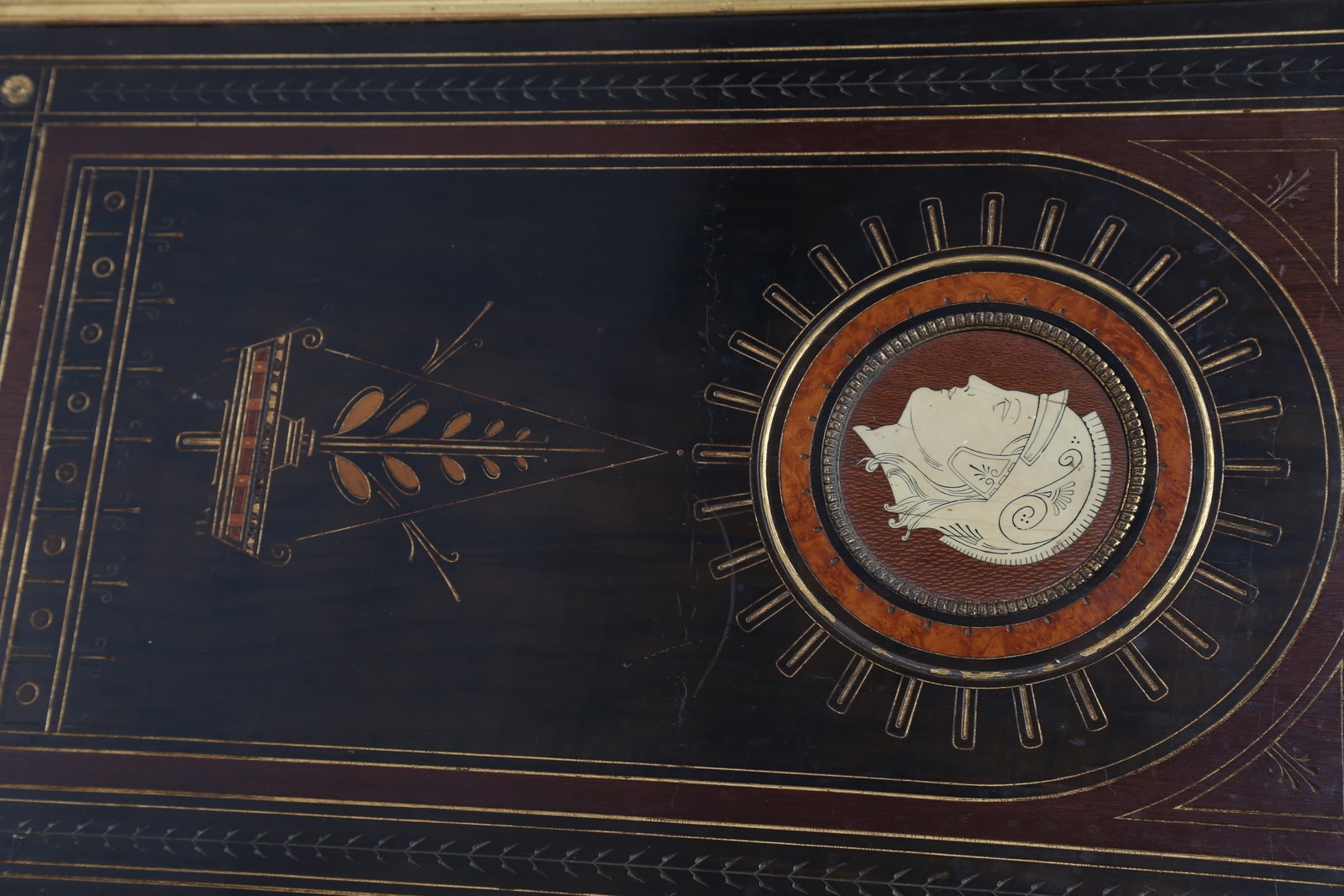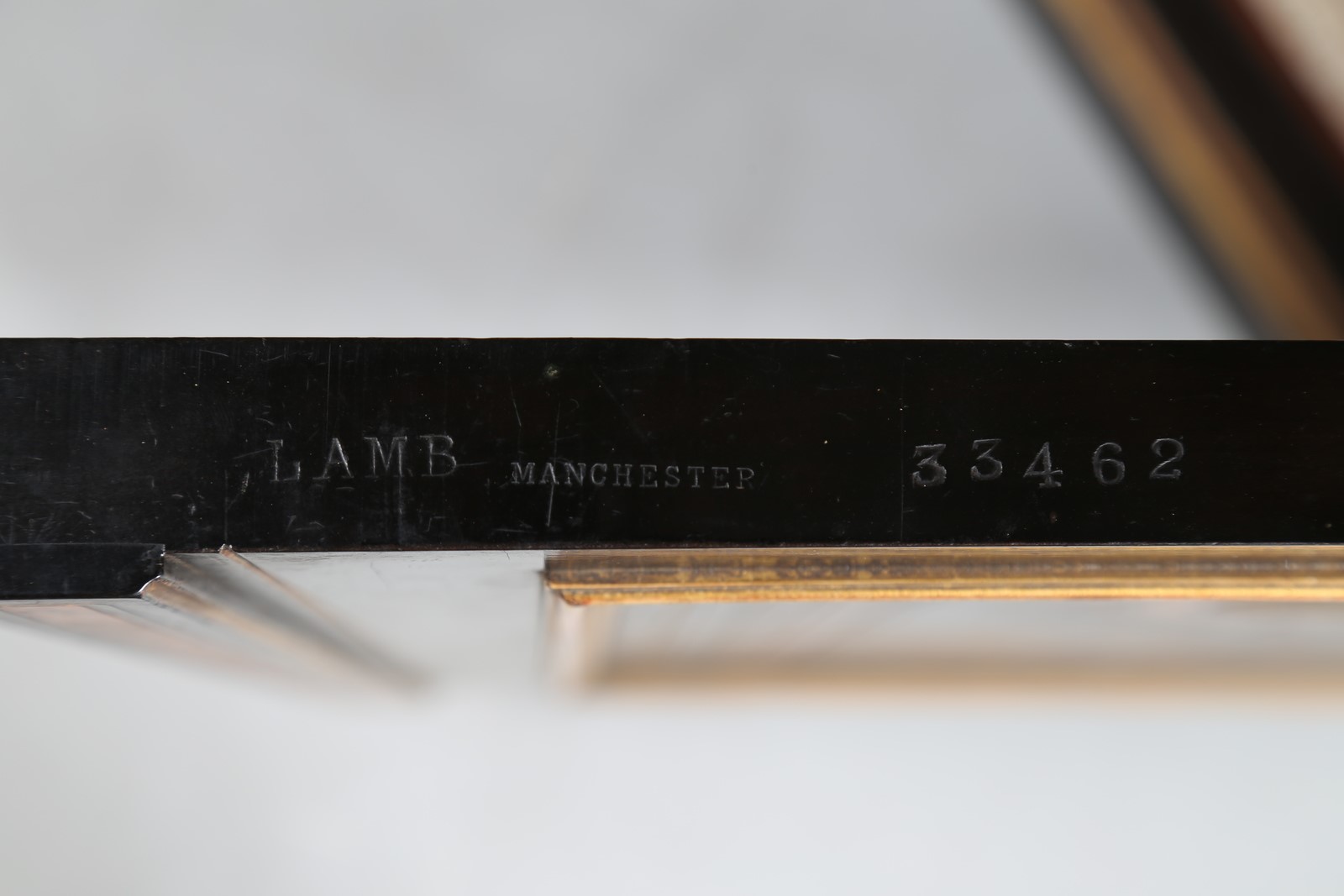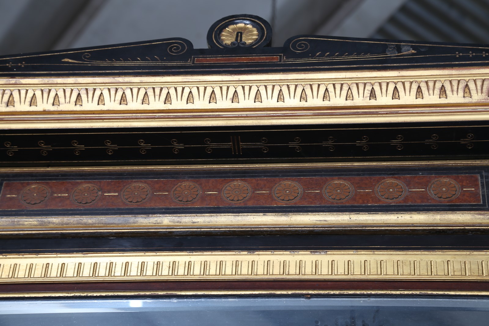 MANIFATTURA LAMB (XIX SECOLO) Importante mobile a doppio corpo, in legno ebanizzato ed intarsiato a raffigurare sulle ante profili classici e festoni. La parte superiore caratterizzata da un grande specchio centrale in cornice sagomata e dorata. Fine XIX secolo. Intarsio su legno. Cm 214,00 x 329,00 x 48,00. Riporta la stampiglia manchester lamb e numero di serie.