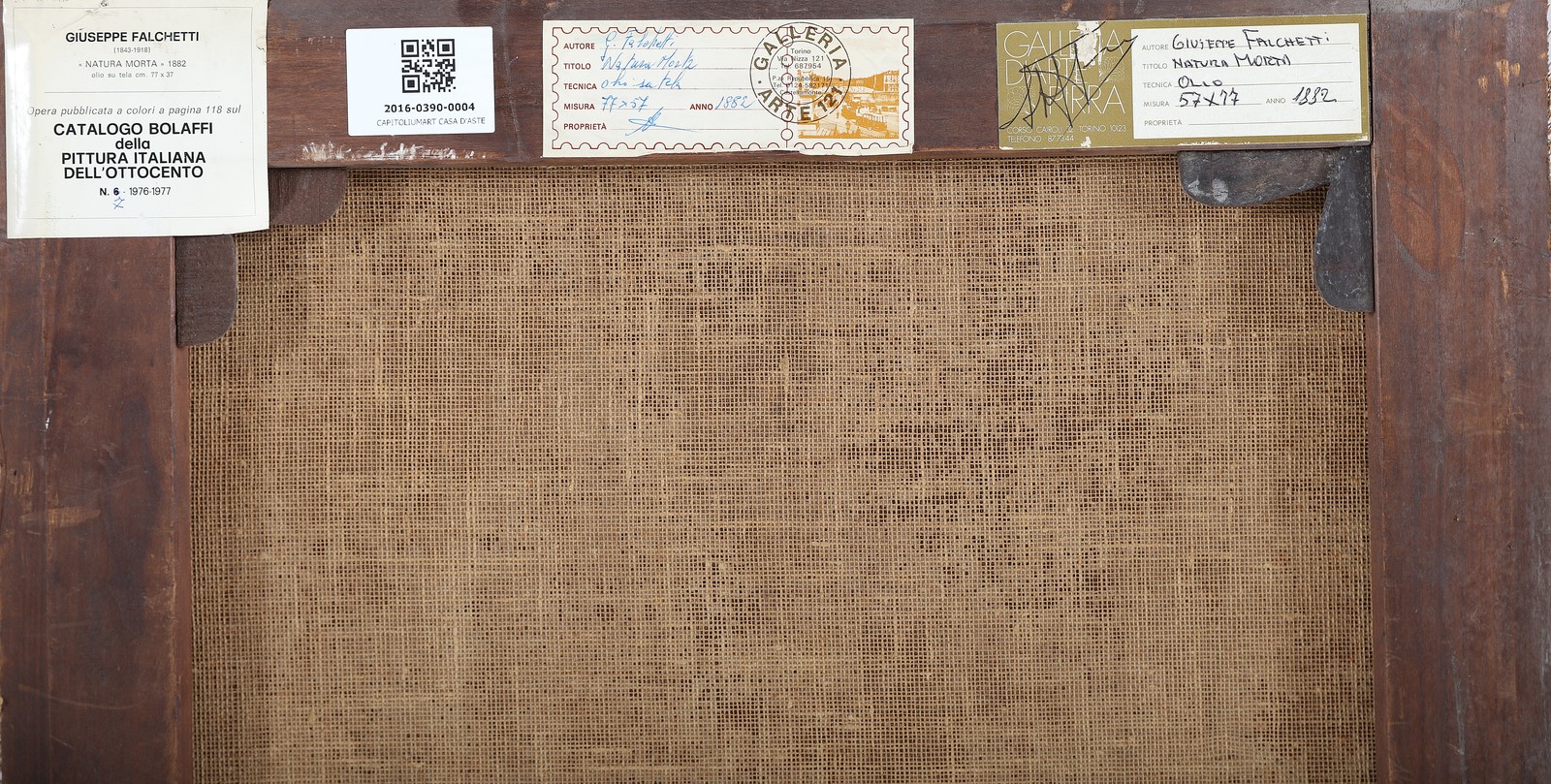 FALCHETTI GIUSEPPE (1843 - 1918) Natura morta di fiori e frutta. 1882. Olio su tela. Cm 57,00 x 77,00. Firmato e datato in basso a sinistra. Al retro cartiglio descrittivo a cura della Galleria d'Arte 121, Torino; Cartiglio a cura della Galleria d'Arte Pirra, Torino. Pubblicazioni: Catalogo Bolaffi della Pittura Italiana dell'Ottocento, pag.118.