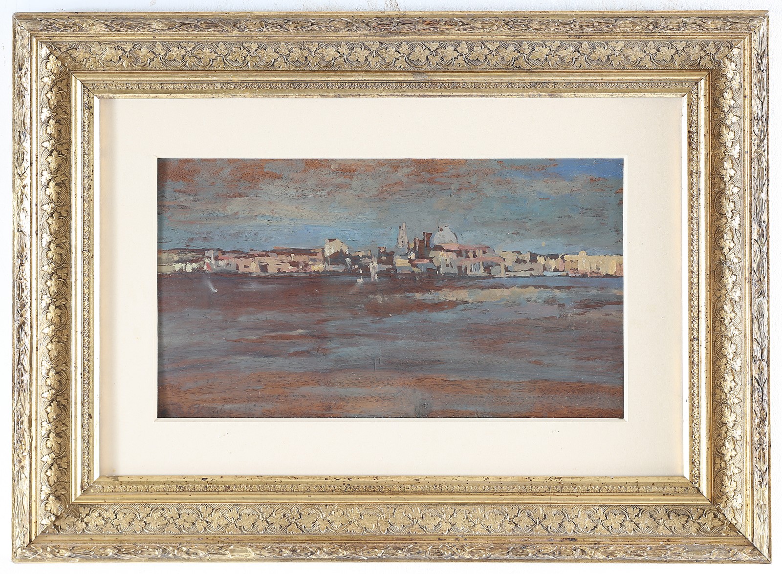 BEZZI BARTOLOMEO (1851 - 1923) Venezia con la chiesa della Salute. Olio su tavola. Cm 39,00 x 22,00. Firma in basso a sinistra. Autentica di Garbiella Belli su fotografia.