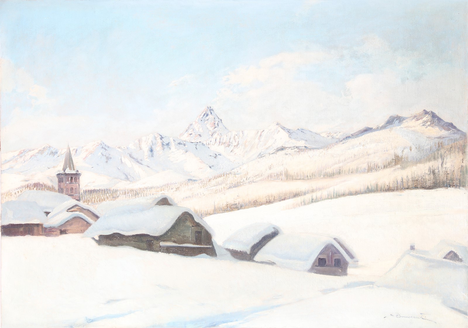 INNOCENTI (XX SECOLO) GIUSEPPE Val Chisone - Alto Piemonte. Olio su tela e tavola. Cm 100,00 x 71,00. Firma in basso a destra.