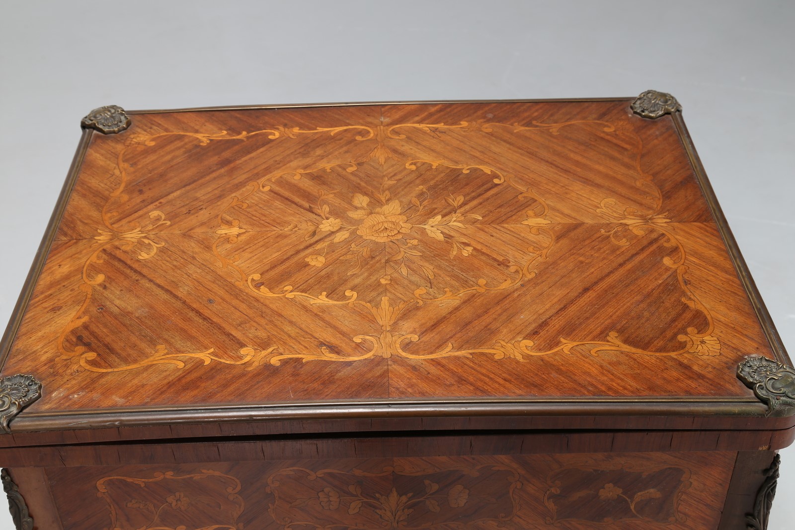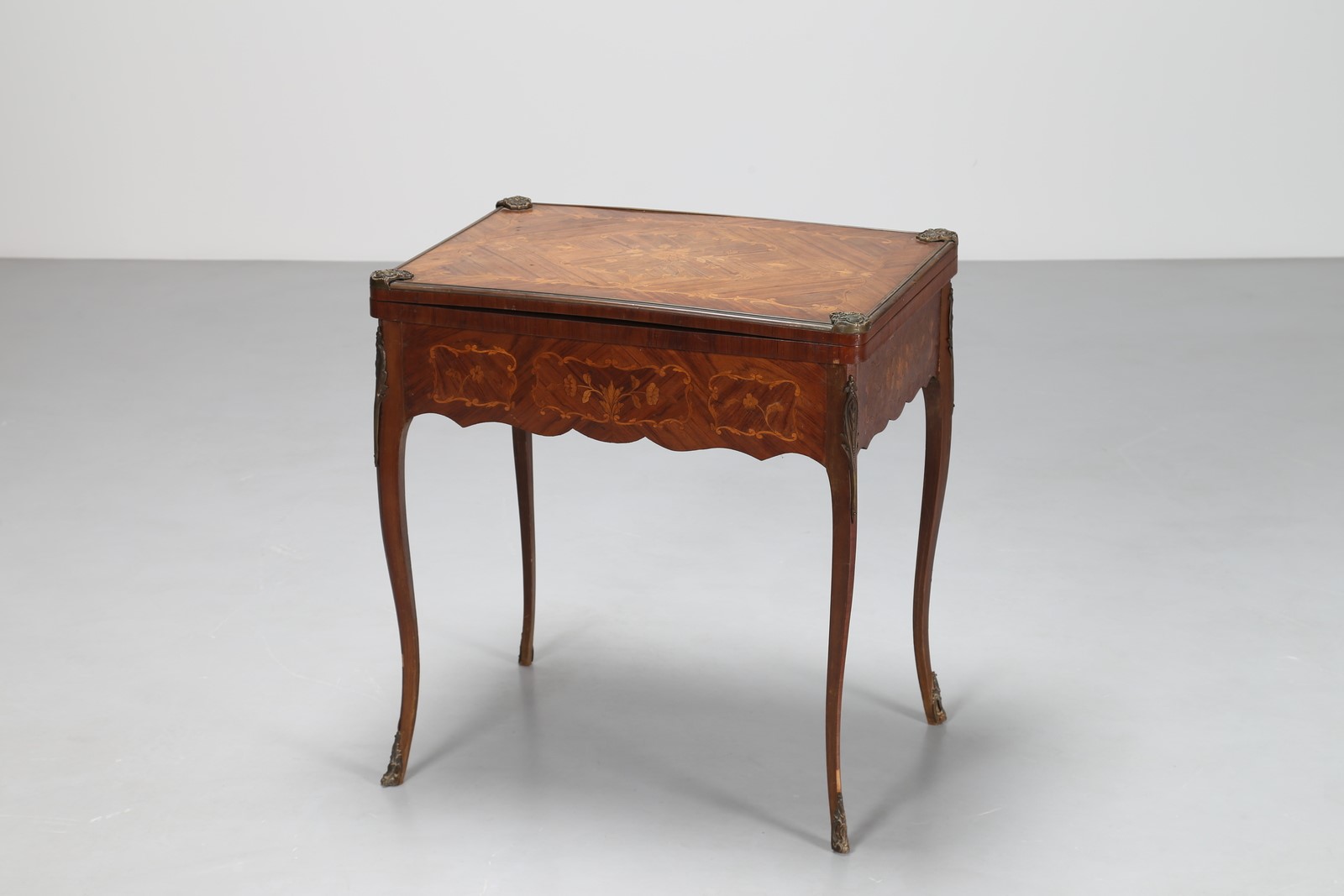 MANIFATTURA FRANCESE DEL XIX SECOLO Tavolo da gioco apribile, lastronato e intarsiato a motivi floreali. . Cm 105,50 x 77,00 x 72,00.