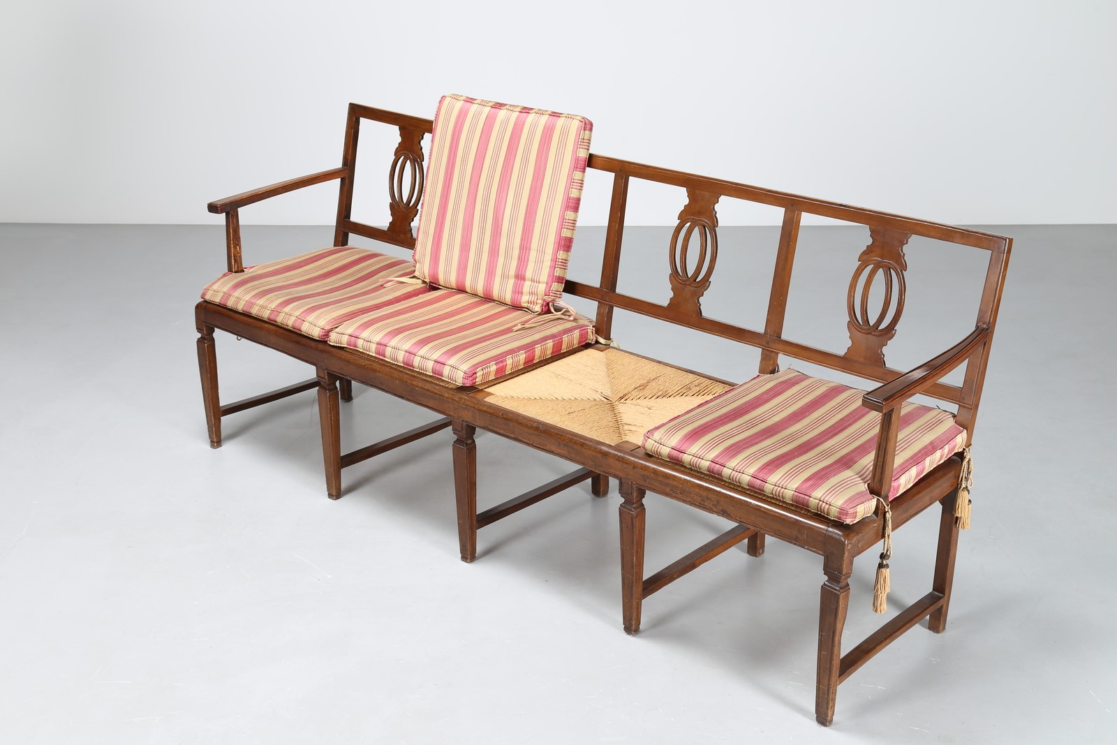 MANIFATTURA ITALIANA DEL XVIII SECOLO Divanetto quattro posti, in legno di noce, gambe a faretra. . Cm 222,00 x 93,00 x 60,00.