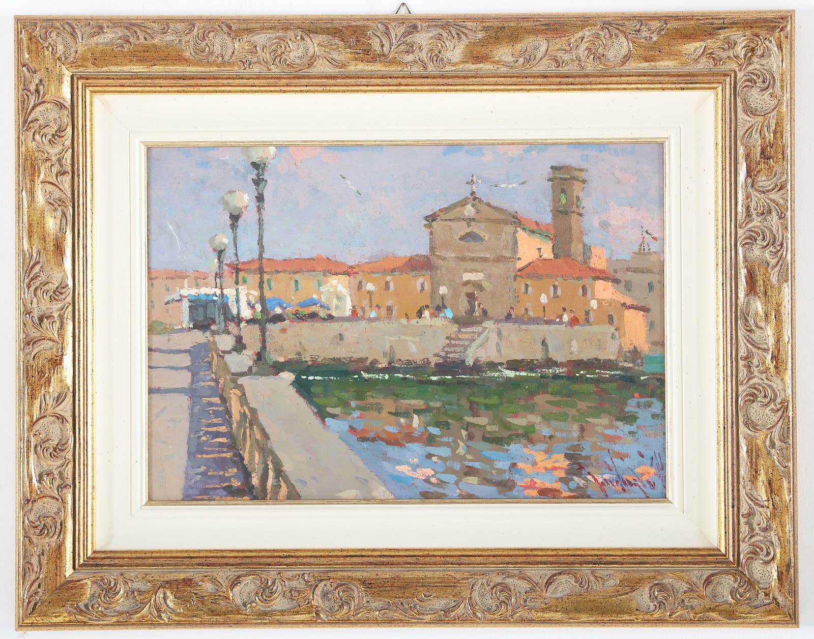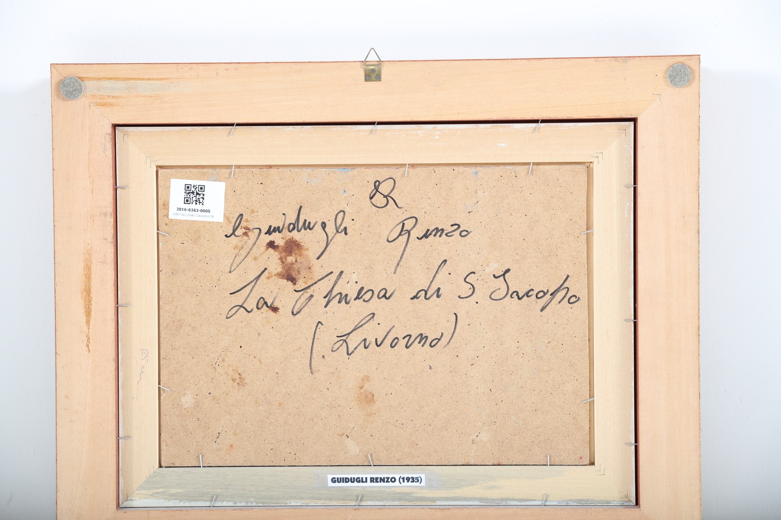 GUIDUGLI RENZO (n. 1935) Livorno, la chiesa di San Jacopo. Olio su compensato. Cm 40,00 x 30,00. Firma in basso a destra. Al retro firma e titolo. Cornice presente