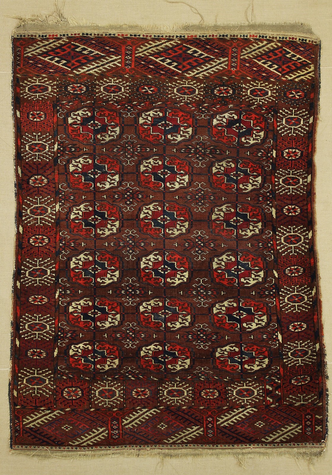 TEKE BUKARA Turkestan Occidentale. 1920 circa. Fondo prugna, 6x3 file di guls. Bordi e testate logori. Conservazione buona. Tappeto. Cm 102,00 x 140,00.