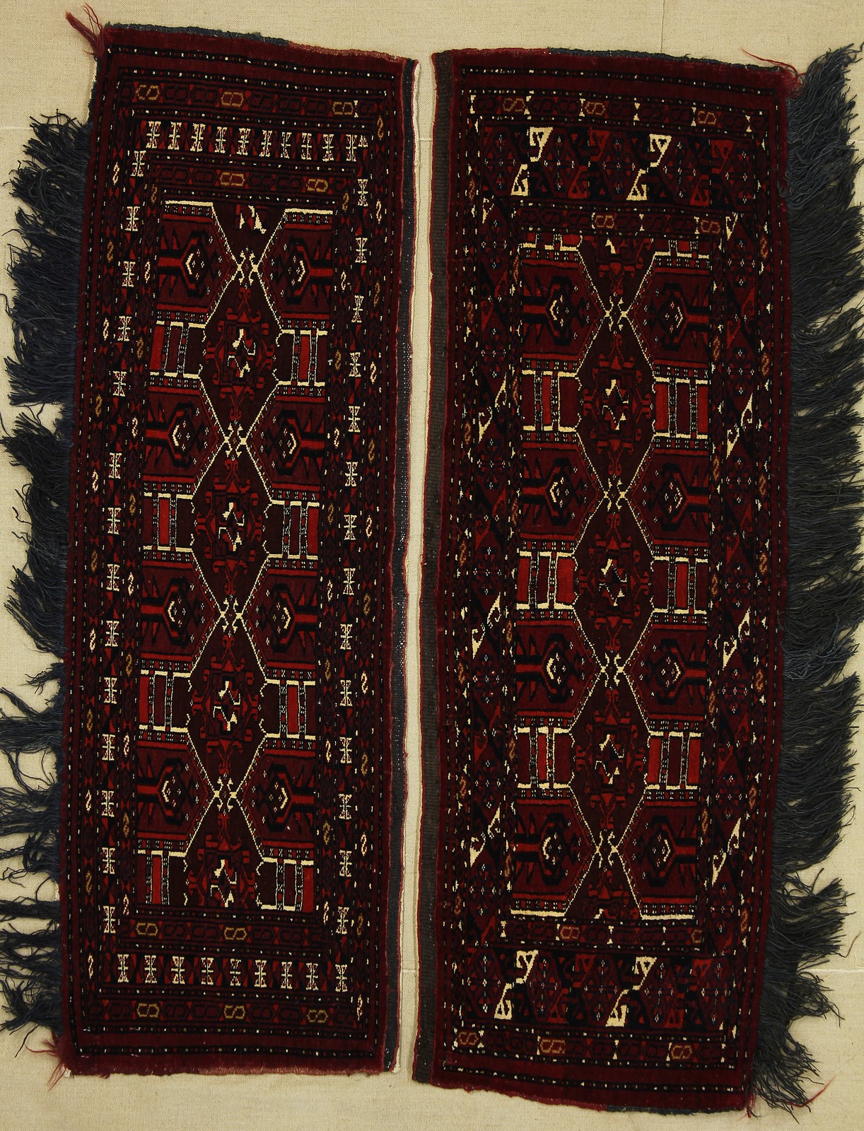 COPPIA TORBE SARIK Turkestan Occidentale. 1930 circa. Fondo sangue cotto, motivi bianchi ( cotone), motivo "kekebe". Conservazione perfetta. Tappeto. Cm 38,00 x 118,00. Lotto composto da n. 2 tappeti.