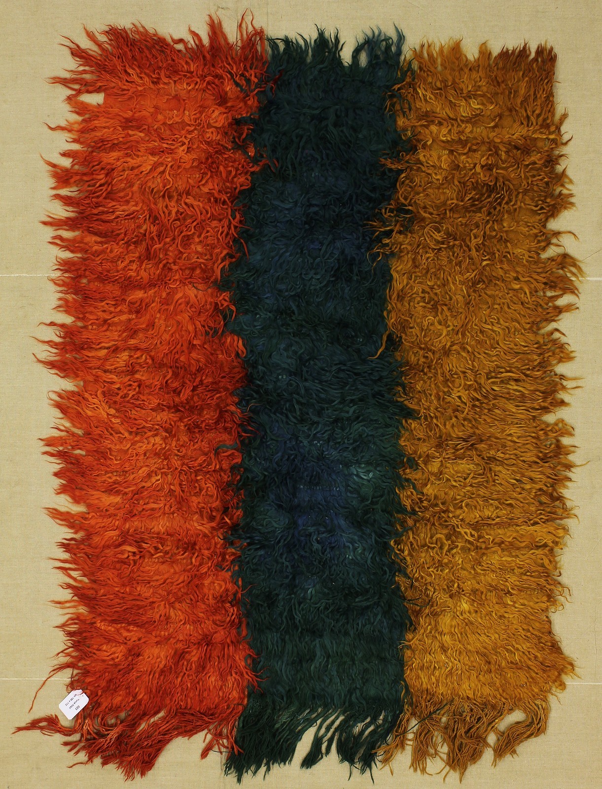 YURUK FILIKLY Turchia. 1940 circa. Disegno formato da 3 strisce ( mattone, blu, giallo), molto peloso. Conservazione ottima. Tappeto. Cm 112,00 x 150,00.