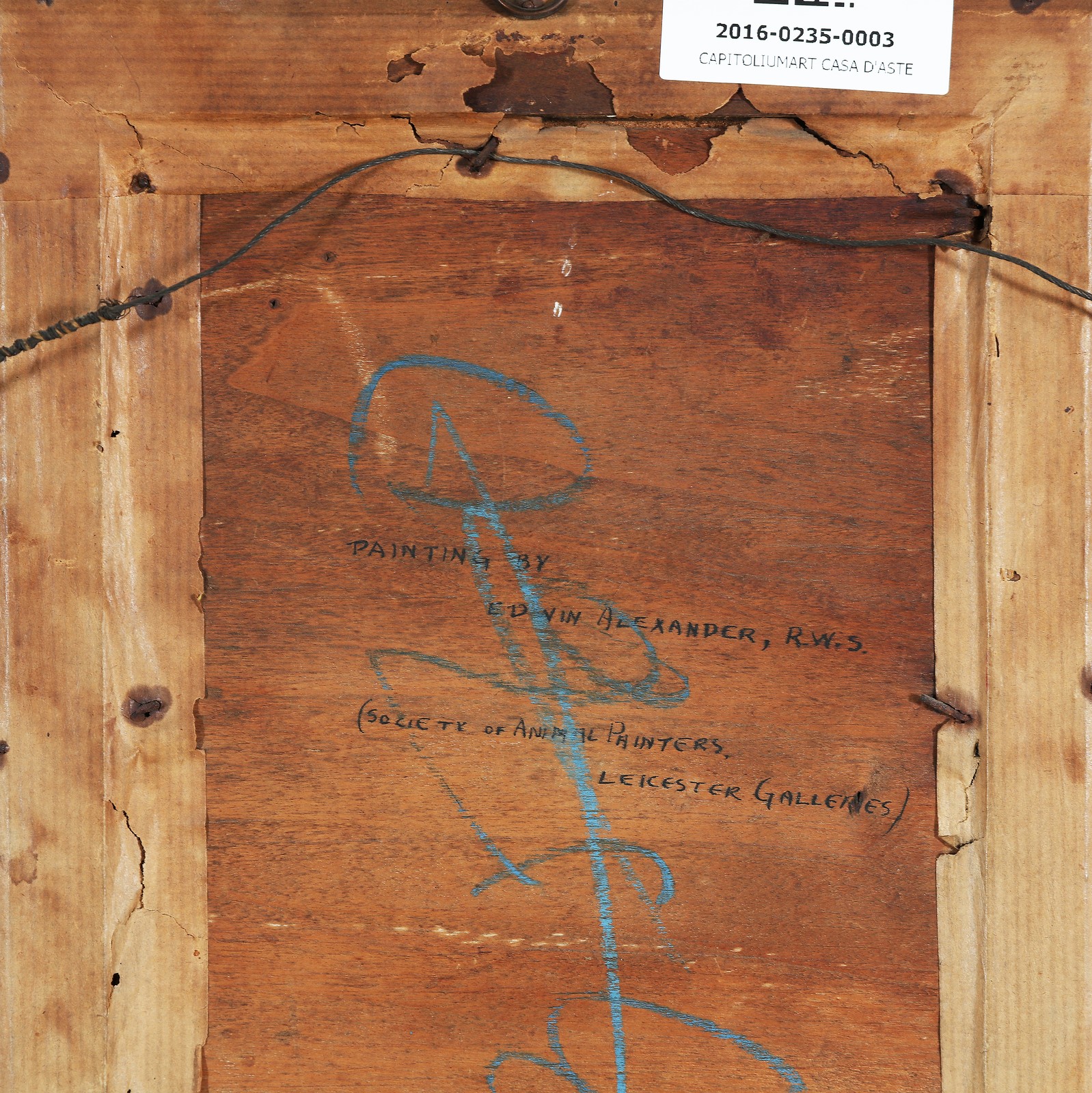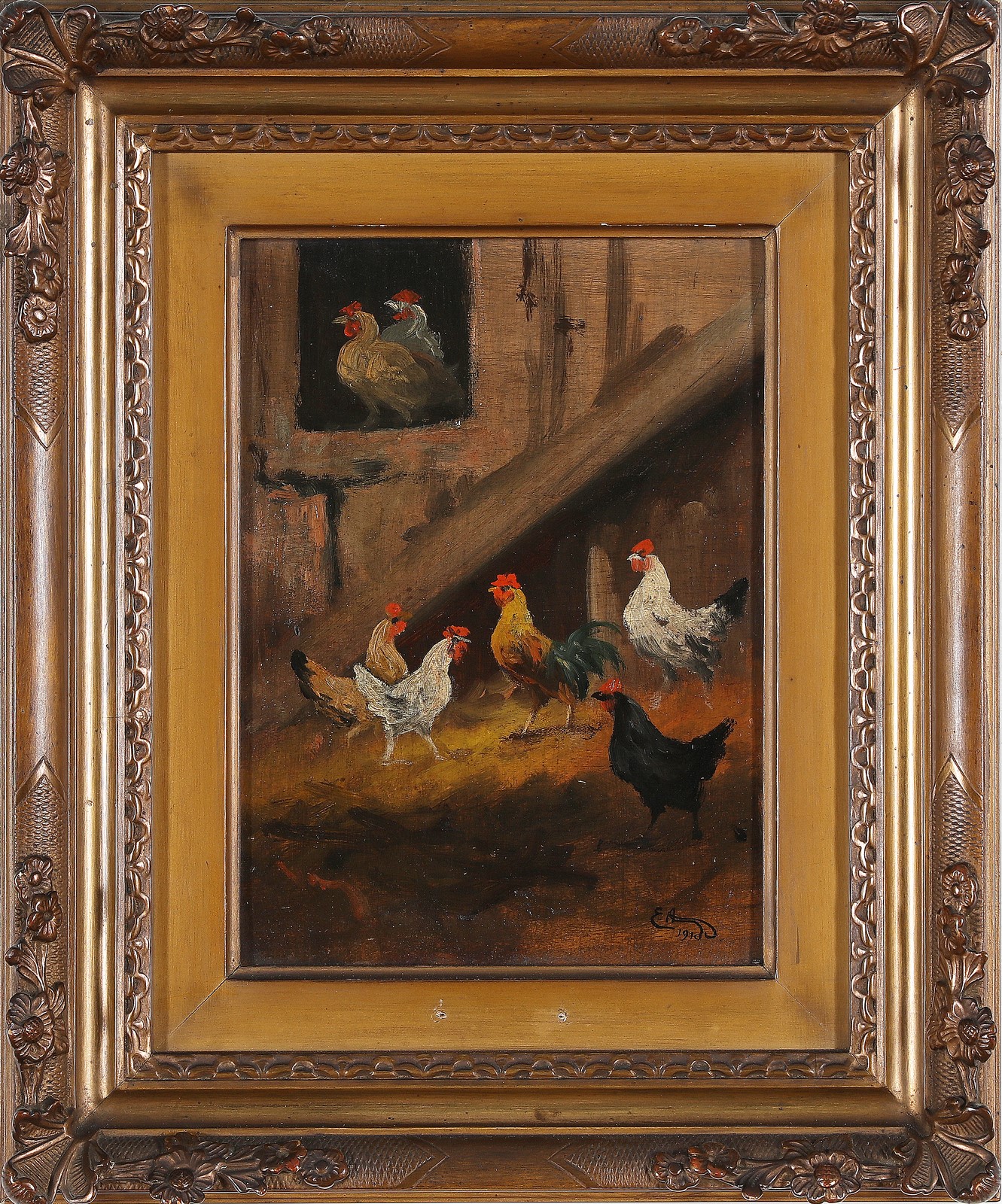 ALEXANDER EDVIN (XIX-XX SECOLO) Galline nell'aia. 1910. Olio su tavola. Cm 21,00 x 28,00. Firma e anno in basso a destra. . Cornice presente
