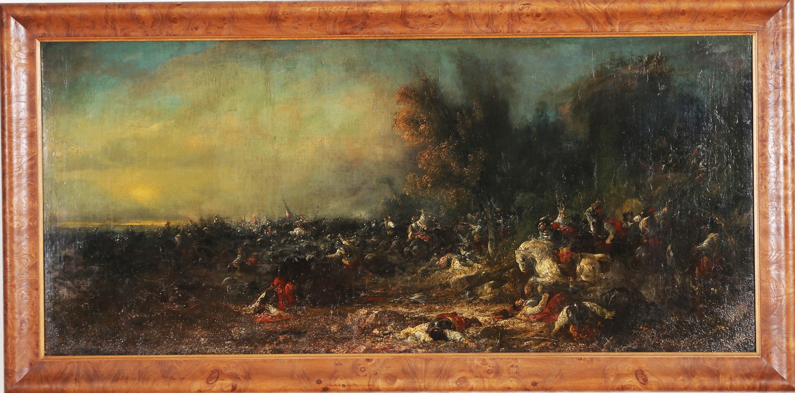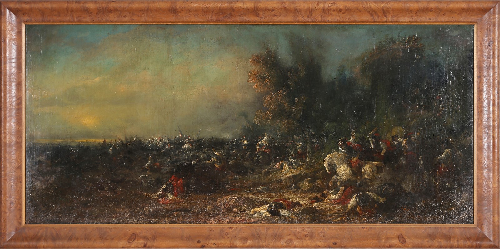 ARTISTA SPAGNOLO DEL XIX SECOLO Battaglia. . Olio su tela. Cm 46,00 x 100,00.