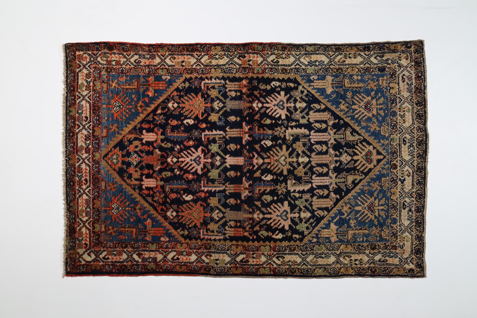 HAMADAN Tappeto orientale. Persia. Lana e cotone. Cm 138,00 x 201,00. Fondo blu, angoli azzurri e bordo chiaro. Ottimo stato di conservazione. 1930 circa.