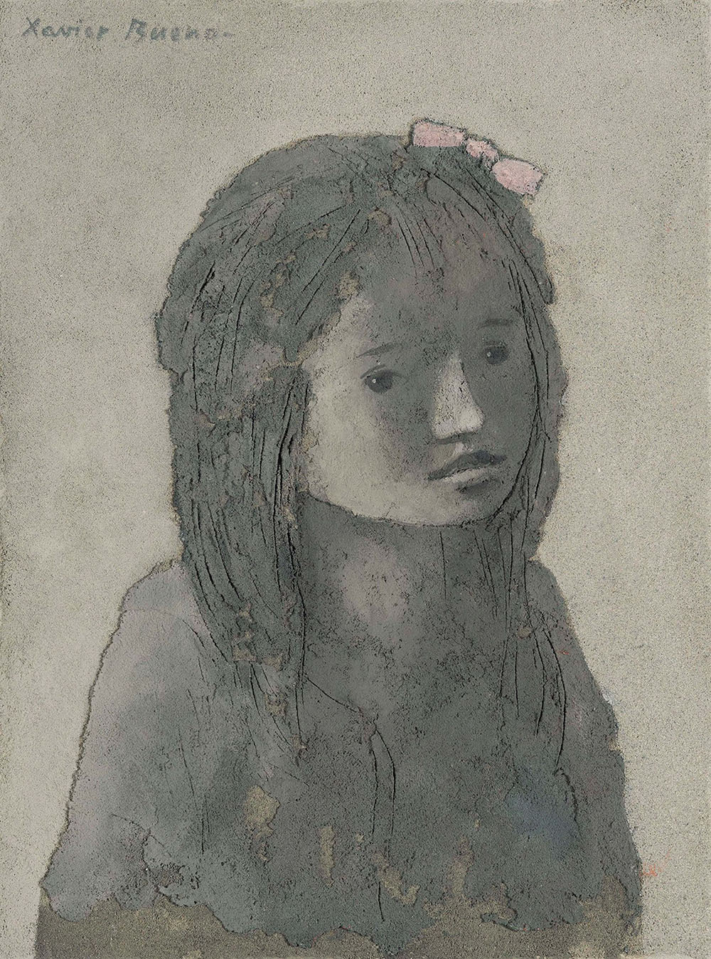 Xavier Bueno (1915-1979), Bambina con fiocco rosso, 1974, olio su tela, cm 40x30 Autentica su fotografia della D.L. Arte srl