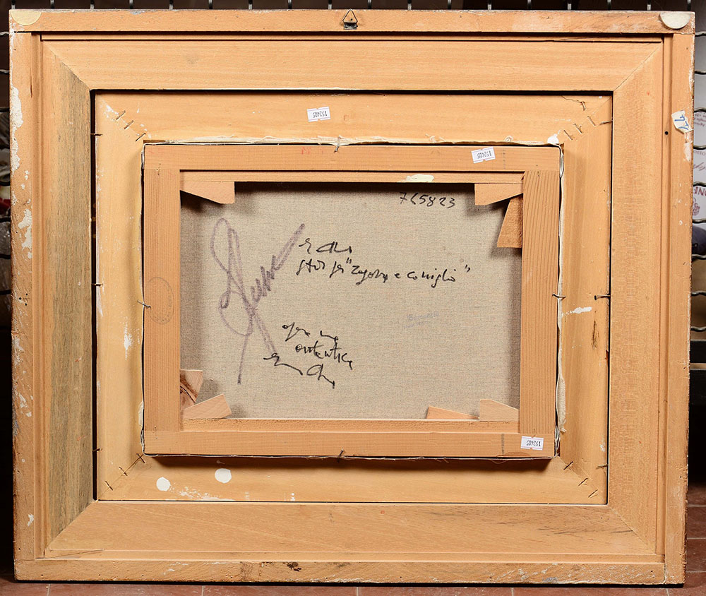 Ennio Calabria (1937), Studio per Ragazza e Coniglio, tecnica mista su tela, cm 30x39,6 firmato in basso a destra irmato,intitolato e autenticato al retro Autentica su fotografia dell’artista