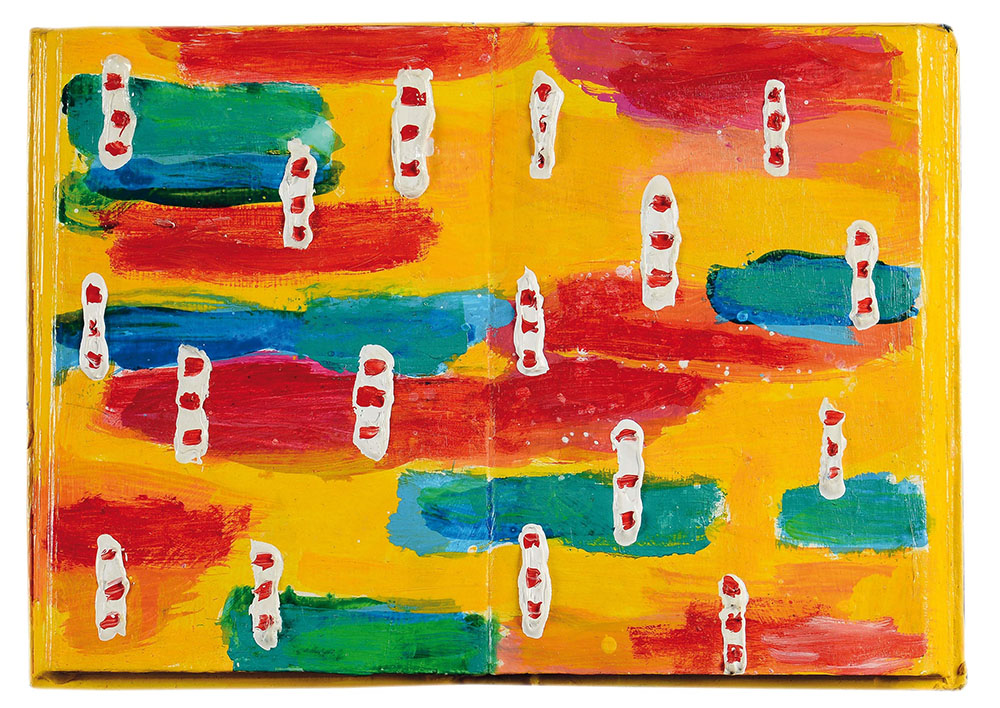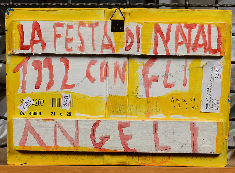 Nicola De Maria (1954), La festa di Natale con gli angeli, 1992, Olio su libro, cm 21x29 intitolato, datato e firmato al retro Certificato di autenticità della Gallerie Lelong, Parigi, in data 07/10/2008