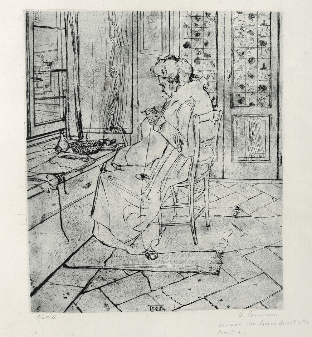 Umberto Boccioni (1882-1916), Mamma che lavora davanti alla finestra, acquaforte in bianco e nero, cm 66x47 foglio, cm 36x30,5. Ed. 5/10. Secondo stato firmata e intitolata in basso a destra