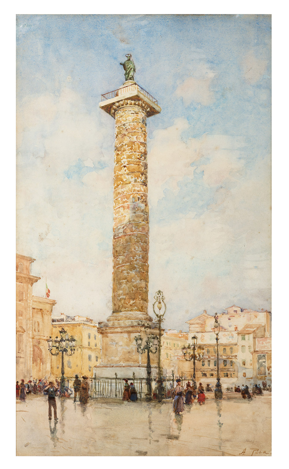ALBERTO PISA, Ferrara 1864 - Firenze 1930, Piazza Colonna a Roma, Acquerello su carta cm 21 x 35, Firma in basso a destra