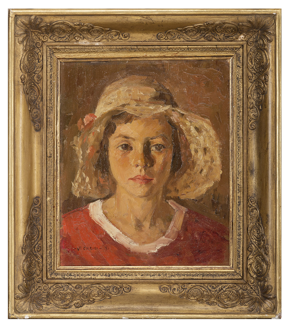VINCENZO CARIDI, Gagliano del Capo 1894 - 1970, Donna con cappello 1931, Olio su tela cm 25 x 22, Firma e data in basso a sinistra