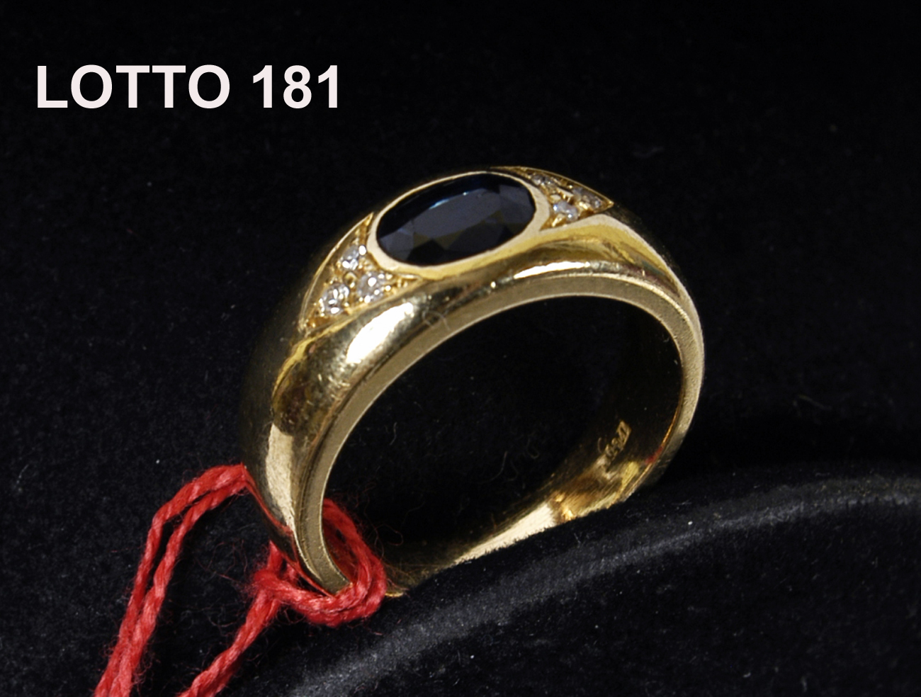 ANELLO FASCIA CON ZAFFIRO OVALE IN ORO GIALLO 750 % GRAMMI 7,30 N° 6 BRILLANTINI CARATI 0,05 ZAFFIRO OVALE CARATI 1,00 CA.