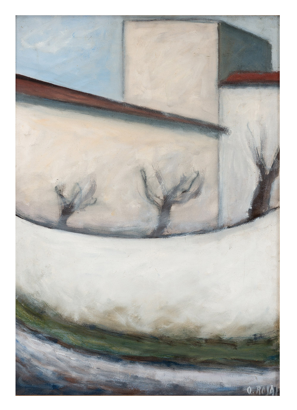 OTTONE ROSAI, Firenze 1895 - Ivrea 1957, Case bianche in paesaggio 1955, Olio su tela cm 70 x 50, Firma in basso a destra, Firma e data al retro sul telaio, Autentica su foto di Luigi Cavallo