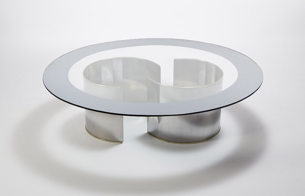 Luigi Caccia Dominioni (1913) Tavolo da salotto modello "Fascia Specchiata". Produzione Azucena, Milano, dal 1970. Piano in cristallo, due sostegni in metallo. (h cm 42, d cm 140) Bibliografia: Catalogo Azucena, Milano, s.d., pp. 142-143 Living room table model "Fascia Specchiata". Produced by Azucena, Milan (h cm 42, d cm 140)
