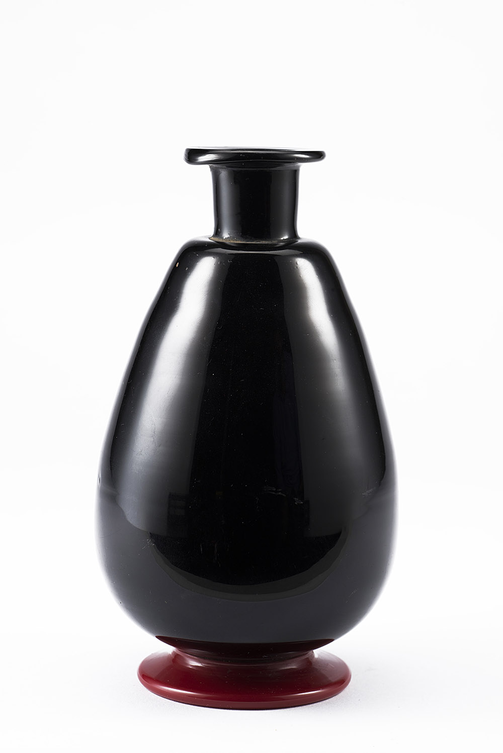 Manifattura di Murano Piccolo vaso in vetro opaco ametista scuro, con base applicata a caldo in vetro opaco rosso. Anni 30 ca. (h cm 17,3) Little Murano vase in dark amethyst opaque glass. 1930s (h cm 17,3)