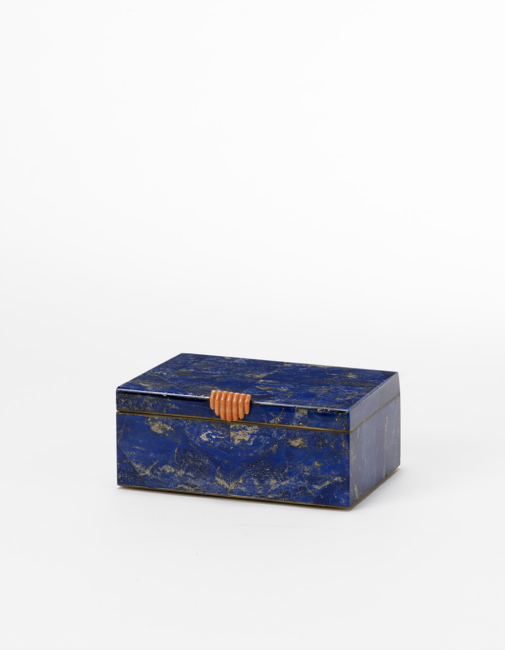 Scatola lastronata in lapislazzulo con presa in corallo ed interno in metallo dorato. Milano, 1930 ca. (cm 13,5x6x10) (difetti) Early 20th century lapis box with coral decoration (defects)