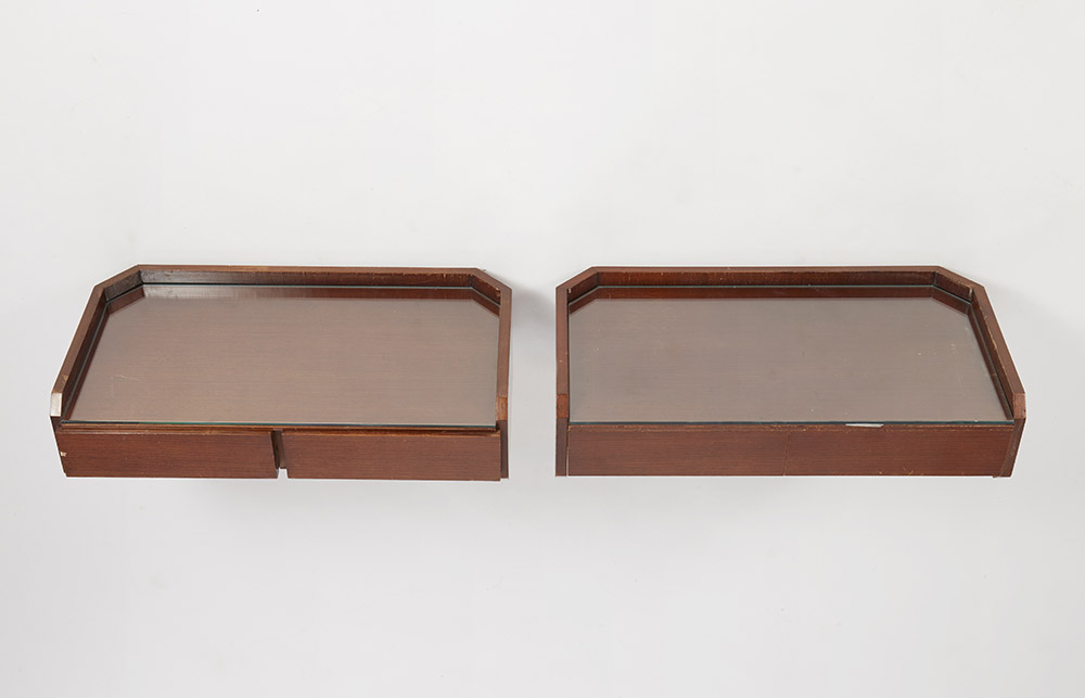 Roberto Poggi Coppia di comodini pensili in palissandro. Piano in vetro. Esecuzione Poggi, Pavia, anni 60 (cm 63x16,5x34) (lievi difetti) Couple of rosewood hanging nightstands. Glass top. Made by Poggi, Pavia, 1960s (cm 63x16,5x34) (minor losses)
