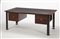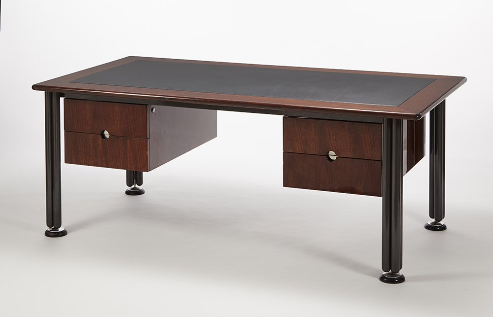 Luigi Caccia Dominioni ( 1913) Scrivania a quattro cassetti della serie "T17". Produzione Azucena, anni 70. Struttura in ferro metallizzato, piano rivestito in pelle e bordato in mogano, cassetti impiallacciati in mogano. (cm 188,5x74x99) (lievi difetti) Four drawers desk from the "T17" series. Produced by Azucena, 1970s. Metallic iron, leather top, mahogany border, mahogany veneered drawers (cm 188,5x74x99) (minor defects)